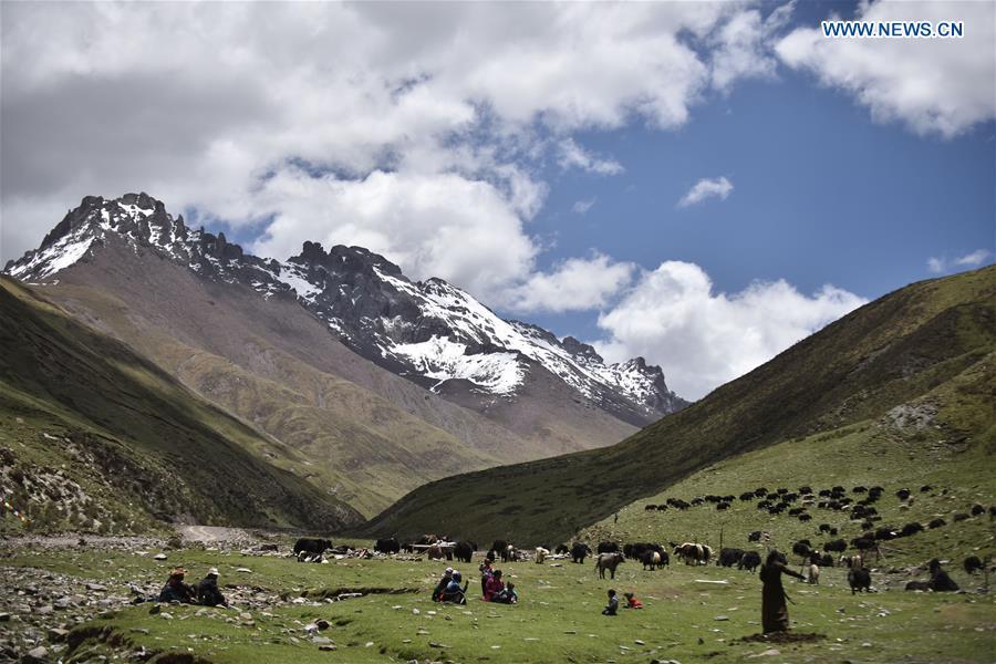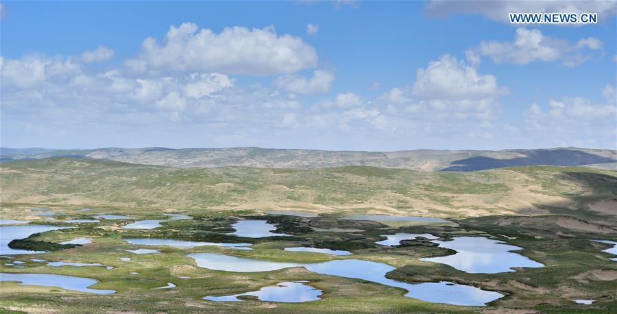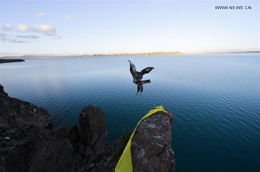 An eagle flies over the Gyaring Lake in Madoi County of Tibetan Autonomous Prefecture of Golog, northwest China's Qinghai Province, July 31, 2014. Over the past decade, lots of efforts have been devoted to rehabilitate the fragile eco-system of Sanjiangyuan and the ecological degrading has been basically curbed. However, there are still problems ranging from overlapping authority, weak law enforcement, lack of public awareness and a conflict between ecological protection and people's need for higher incomes. The Sanjiangyuan National Park has experienced system reform recently. The administration bureau will develop tourism, organic farming and stockbreeding in certain areas and test new management methods such as charity work, a grassland compensation mechanism and volunteering. (Xinhua/Wu Gang)