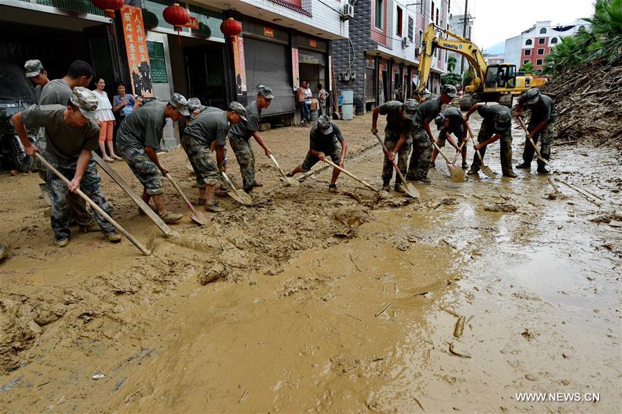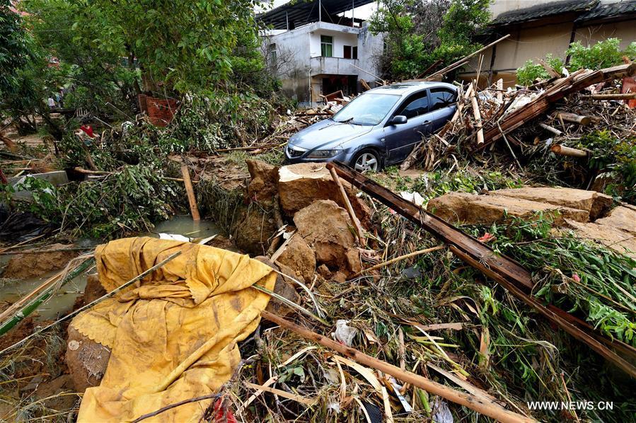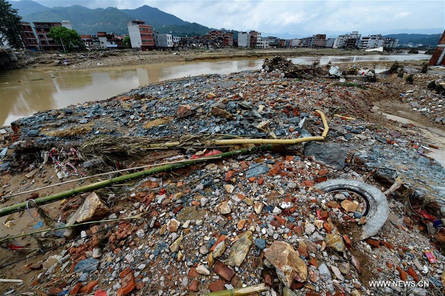 Cars are washed away by the flood at Bandong Township in Minqing County, southeast China's Fujian Province, July 11, 2016. Nepartak, the first typhoon of the year, brought heavy rain to Minqing, causing 79,000 mu (5,267 hectares) of crops flooded, over 3,144 houses destroyed and 95,000 people affected. Ten people were dead and 11 people were missing due to the typhoon Nepartak. Rescue and relief works are underway at present. (Xinhua/Zhang Guojun)