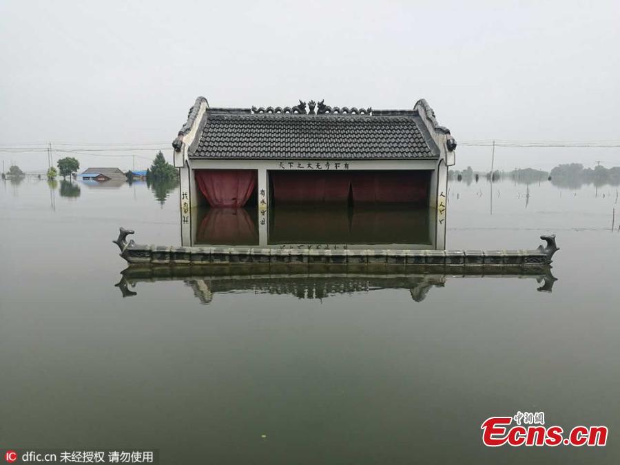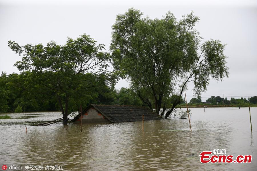 A car is submerged in floodwater in Langxi County of Xuancheng City, East China’s Anhui Province, July 11, 2016. Seven people died and more than one million residents are affected by strong rains that began June 20 across the city’s seven regions. (Photo/IC)
