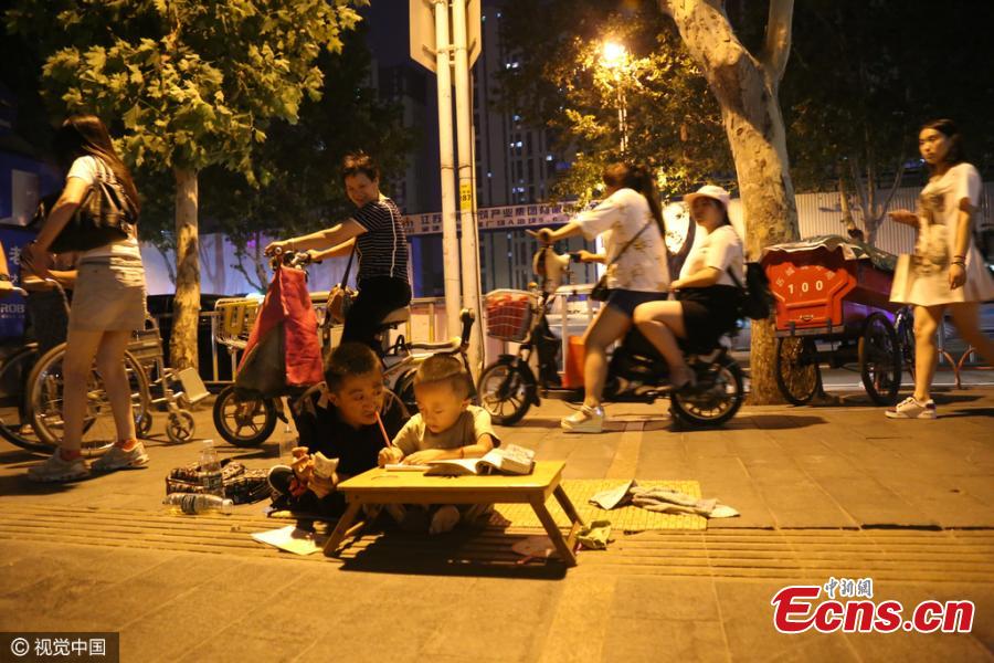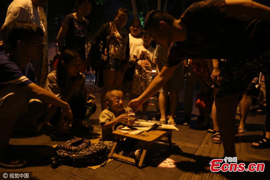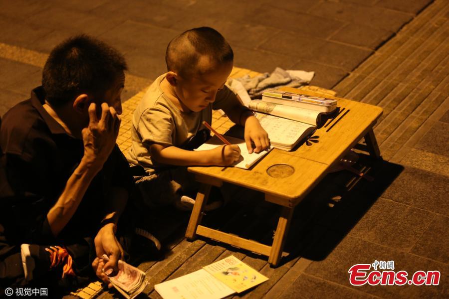 A man suffering osteogenesis imperfecta (OI), also known as brittle bone disease, begs while tutoring his son, who has the same disease, under a streetlight in Jinan City, the capital of East China’s Shandong Province, July 11, 2016. The seven-year-old boy can read 100 Chinese characters but no school is willing enroll him. (Photo/CFP)