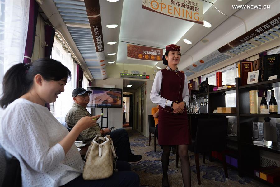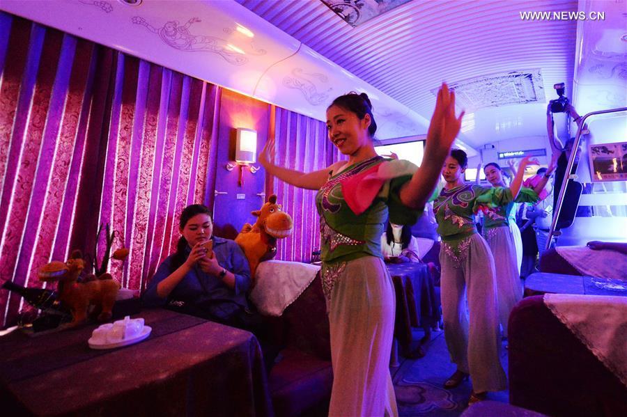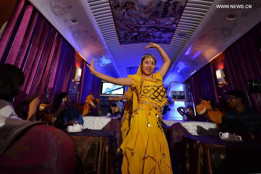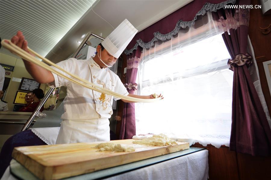A chef makes stretched noodles on the Z218/7 train running from Lanzhou of northwest China's Gansu Province to Shanghai, July 12, 2016. Since summer this year, several trains departing from Lanzhou Railway Station were upgraded for better passenger experience, adding coaches with cinemas, bars, shops and so on. (Photo:Xinhua/Chen Bin)