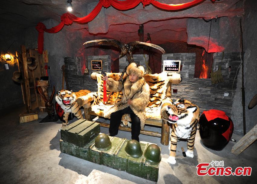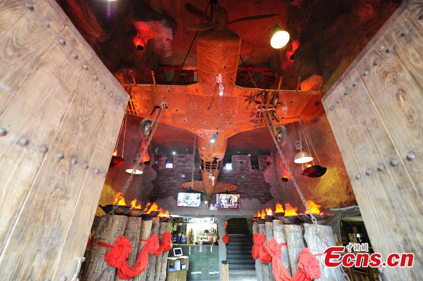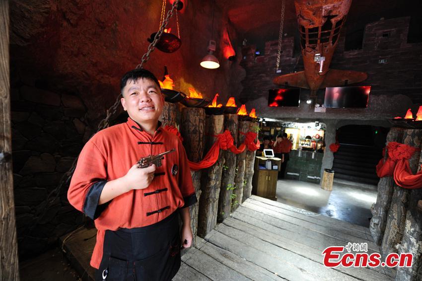 A theme restaurant inspired by the film The Taking of Tiger Mountain opened in Changchun, Jilin province, on July 12, 2016. Decorated with fake weapons and ammunition boxes, the restaurant looks like headquarters of bandits. The pendants' covers are made by steel helmets, and each waiter carries a pistol-shaped clipper. Many people were attracted to grab a meal in the restaurant. (Photo: China News Service/Zhang Yao)