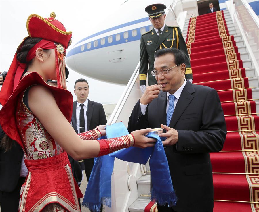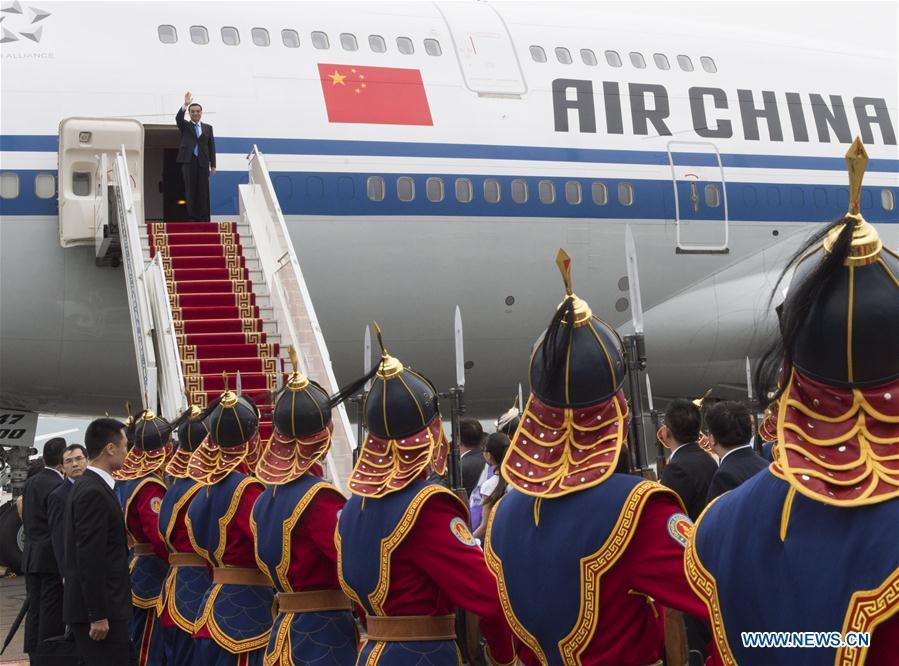 Chinese Premier Li Keqiang (2nd L front) arrives at Ulan Bator, Mongolia, July 13, 2016. Li arrived here Wednesday for an official visit to Mongolia and the 11th Asia-Europe Meeting (ASEM) summit.(Xinhua/Pang Xinglei)