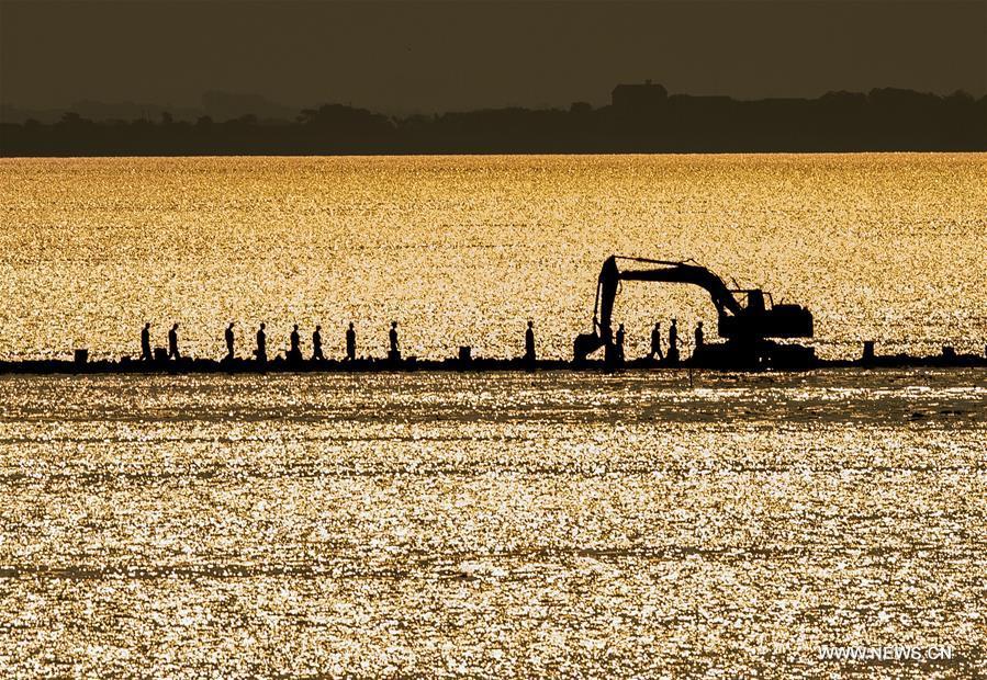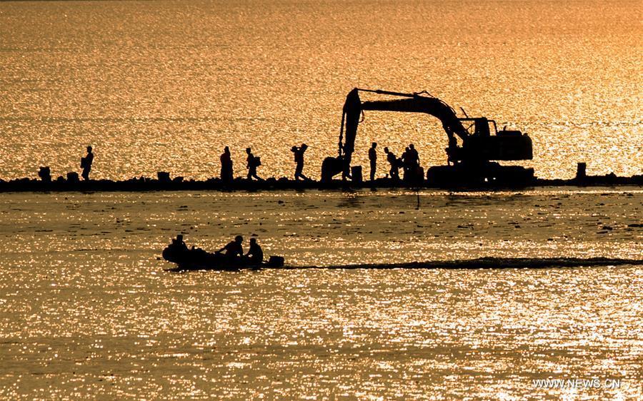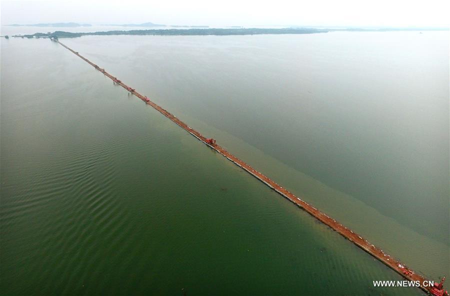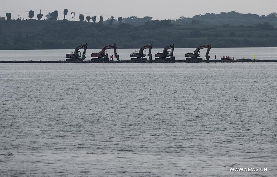 Armed police soldiers prepare for the breach of the embankment on the dike of Niushan Lake in central China's Hubei Province, July 13, 2016. The Hubei provincial government Tuesday decided to break the embankment between Liangzi Lake and Niushan Lake, to prevent possible flood overflow over the dike. The operation will be executed on July 14. (Photo:Xinhua/Cheng Min)