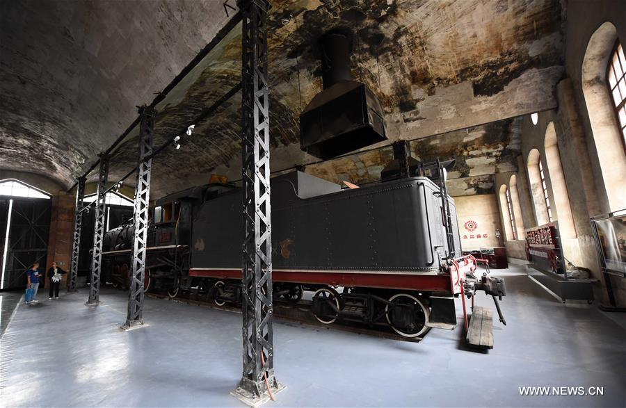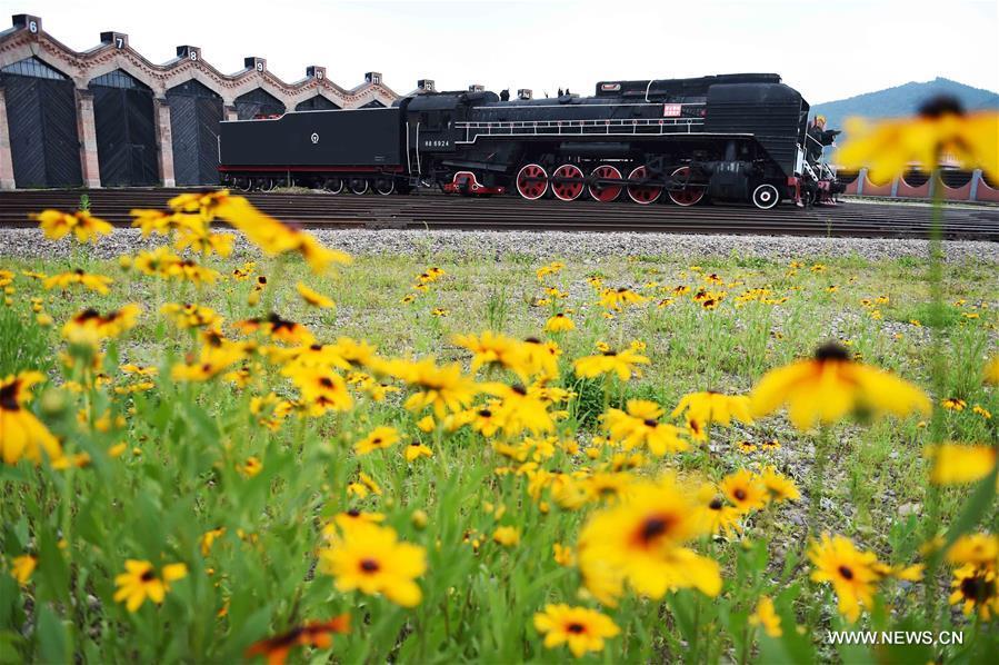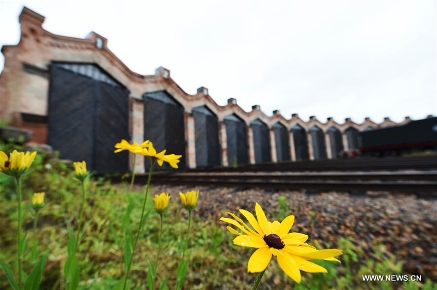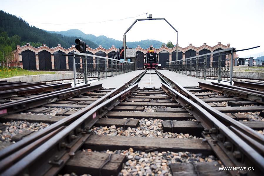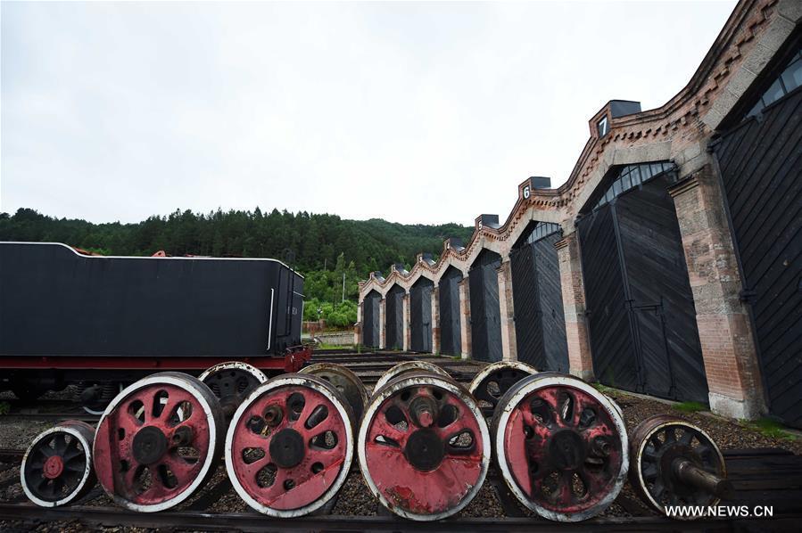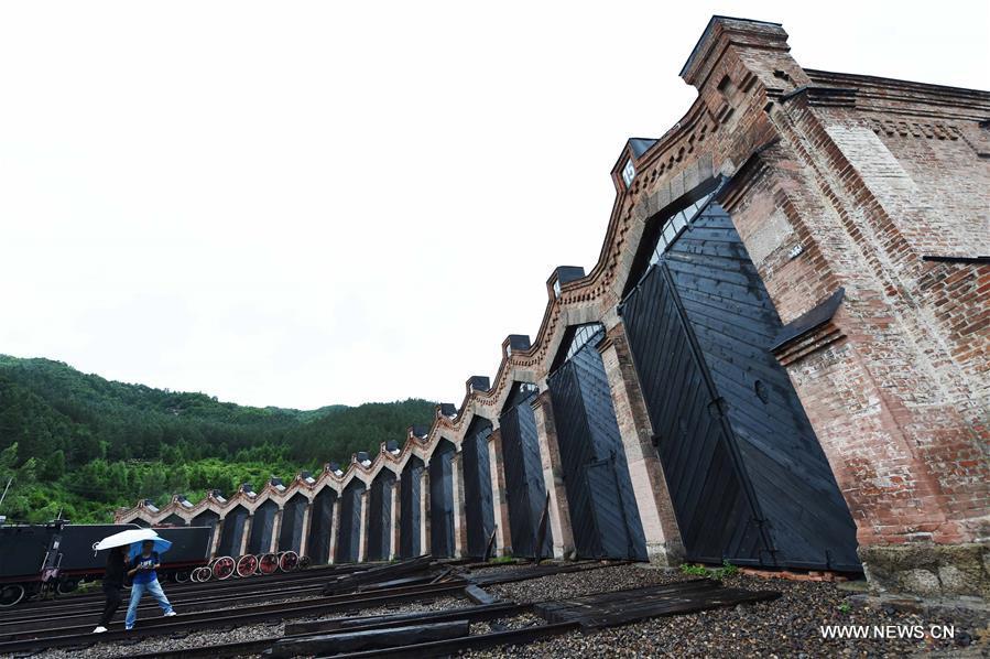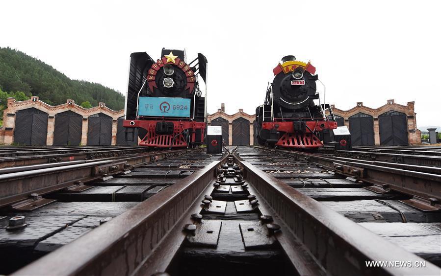 Two locomotives are parked in front of a garage on the historical Chinese Eastern Railway in Hengdaohezi Township in Hailin, northeast China's Heilongjiang Province, July 12, 2016. The Russian-style garage in Hengdaohezi was built in 1903 and will be open to the public as a railway transportation museum as well as a cultural relic. (Xinhua/Wang Jianwei)