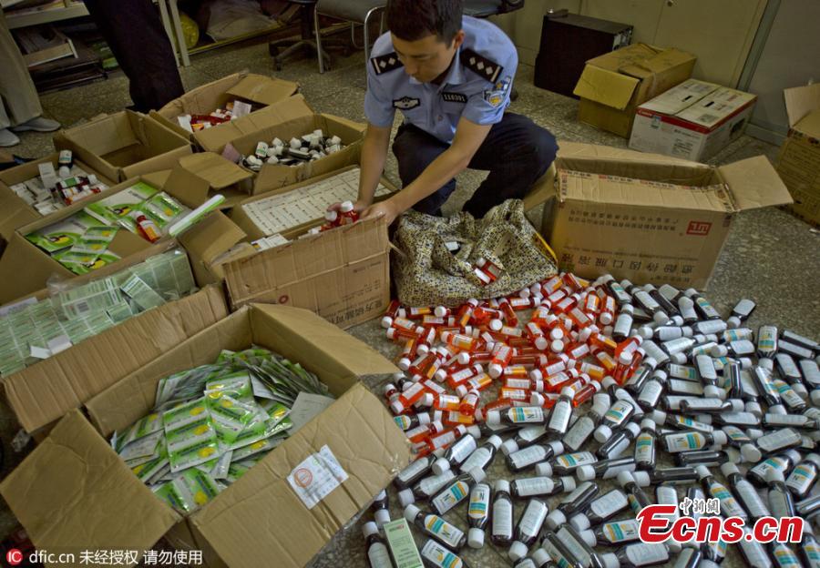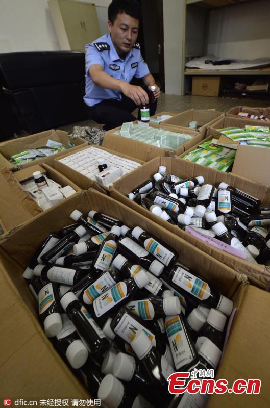 A police officer shows drugs seized during a raid at a police station in Shenyang City, the capital of Northeast China’s Liaoning Province, July 12, 2016. Local police have busted a drug ring that used the Internet to traffic drugs, catching 17 suspects and confiscating drugs with a market value of more than 1.6 million yuan ($239,000). (Photo/IC)
