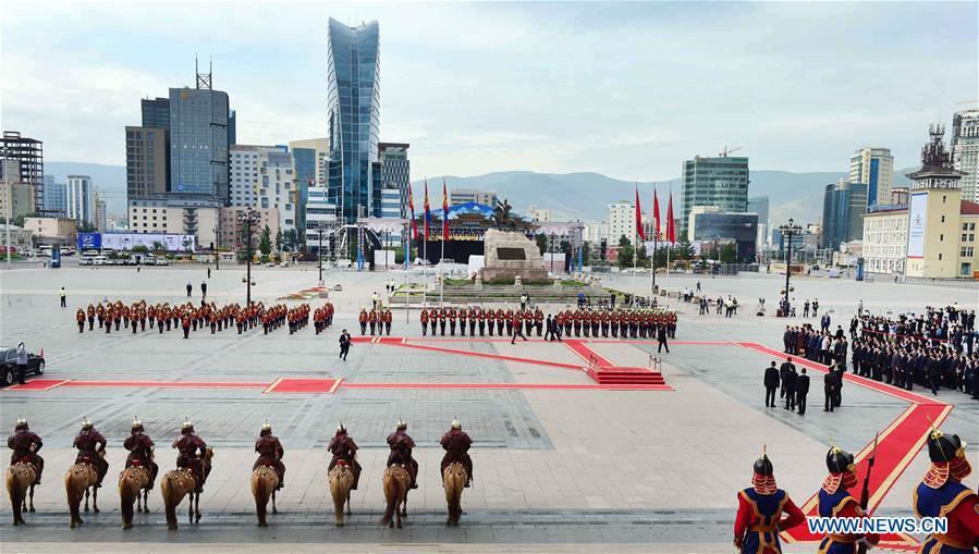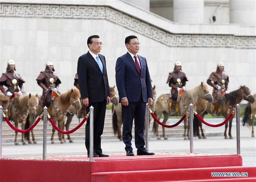 Chinese Premier Li Keqiang (R) attends a welcoming ceremony held by Mongolian Prime Minister Jargaltulga Erdenebat (L) before their talks in Ulan Bator, Mongolia, July 14, 2016. (Xinhua/Pang Xinglei)
