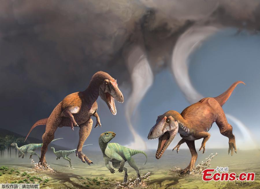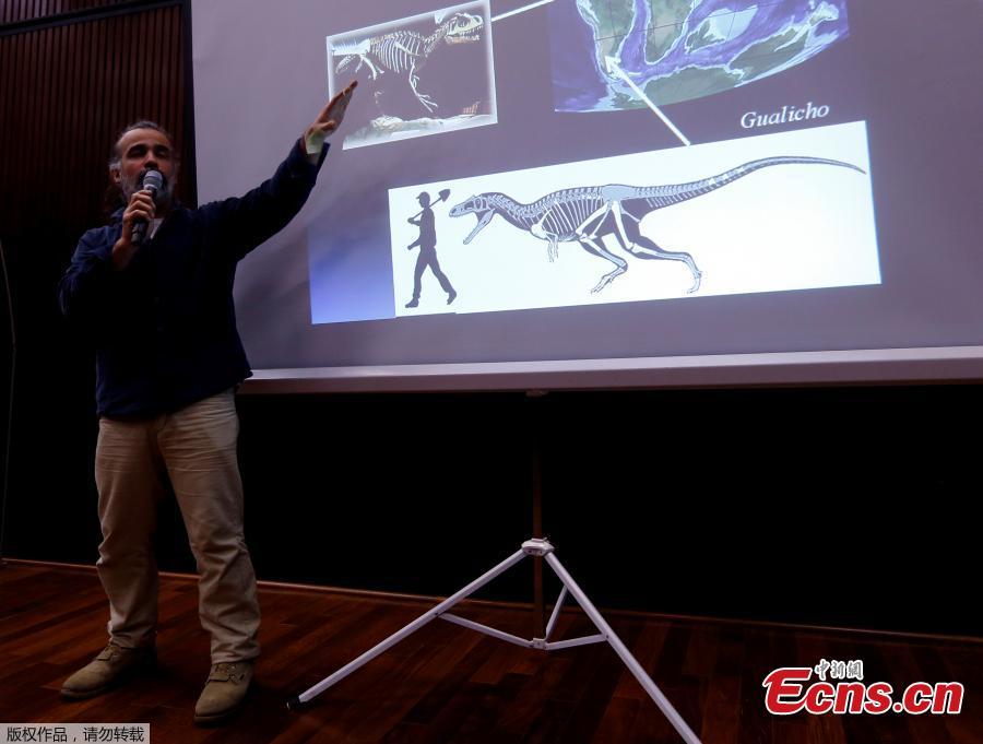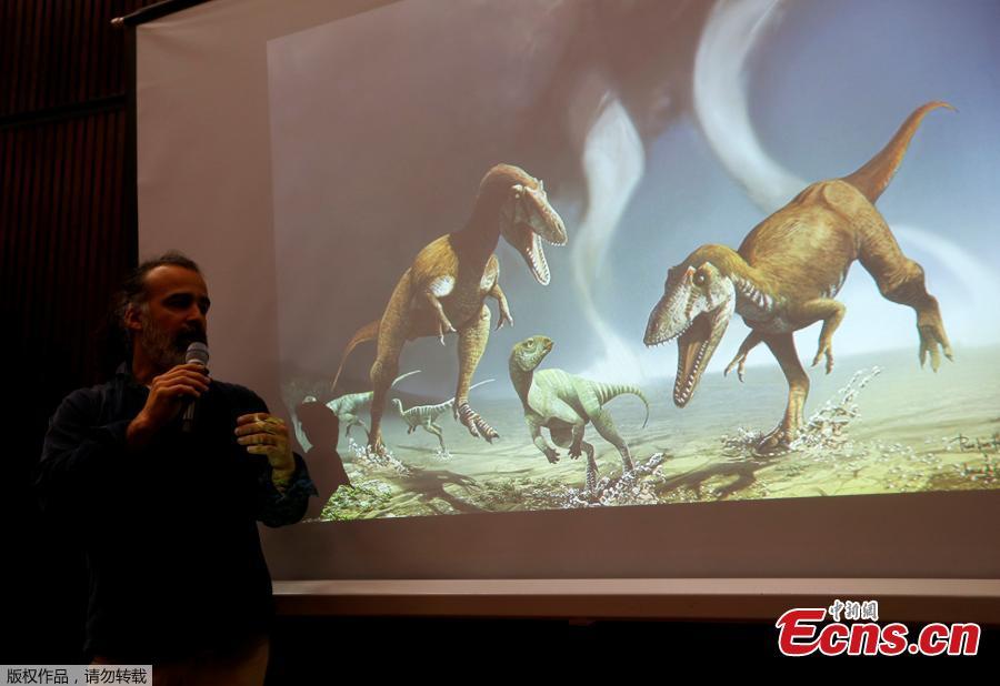 A woman takes photos of a replica of a newly discovered meat-eating dinosaur that prowled Argentina 90 million years ago, in Buenos Aires, July, 13, 2016.(Photo/Agencies)