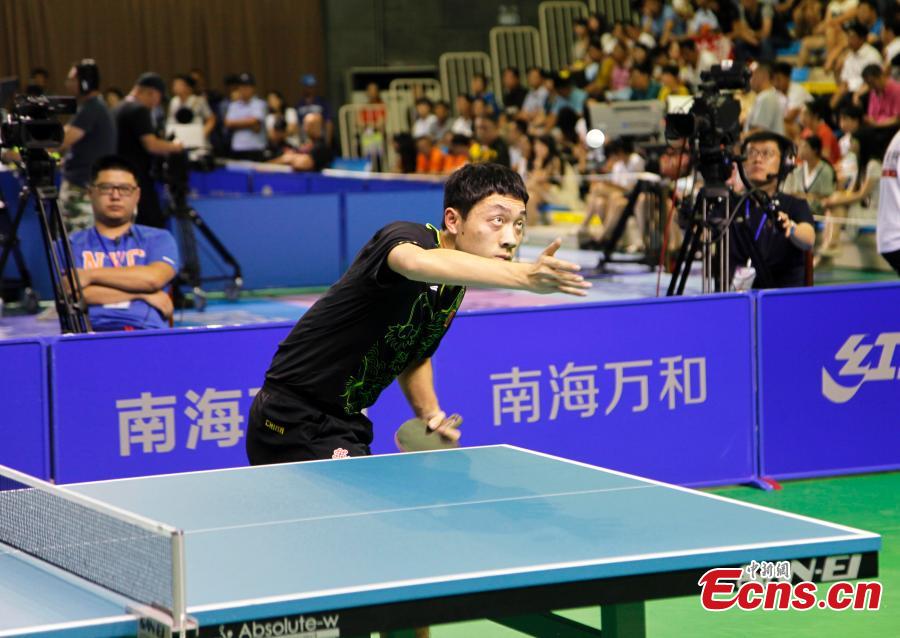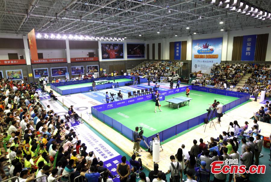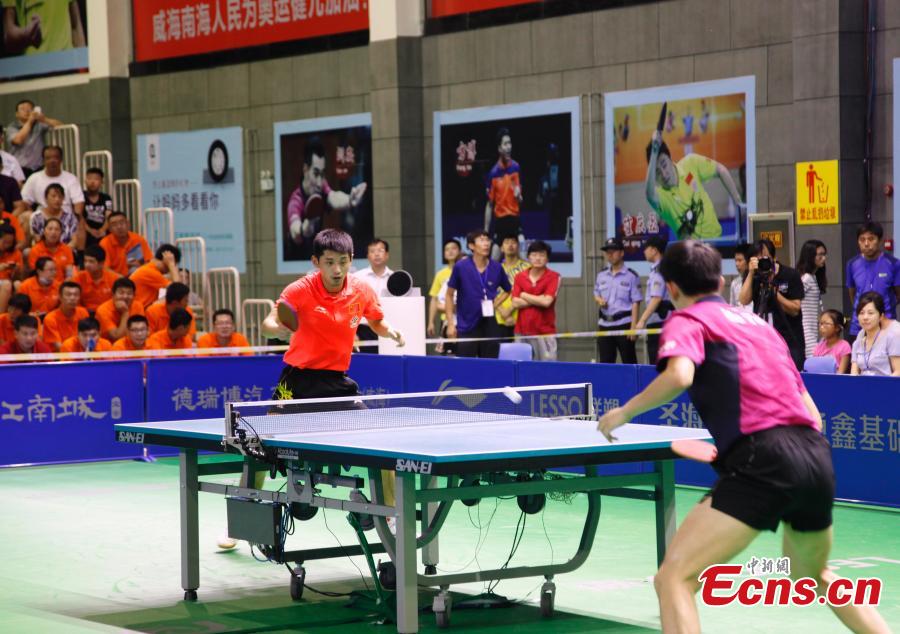 Players from China’s men’s table tennis squad compete in warm-up matches in the lead-up to the Rio Olympics in Weihai City, East China’s Shandong Province, July 14, 2016. The matches were set up with environmental conditions and schedules similar to those the players will experience at the Olympics. (Photo: China News Service/Liu Changyong)