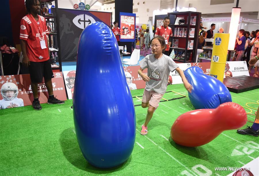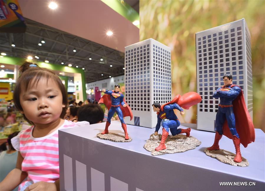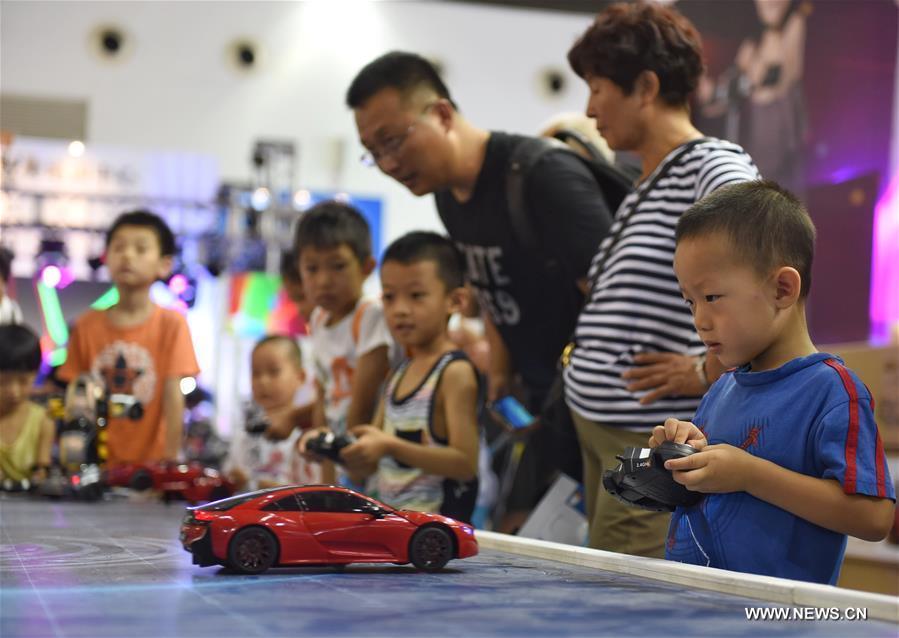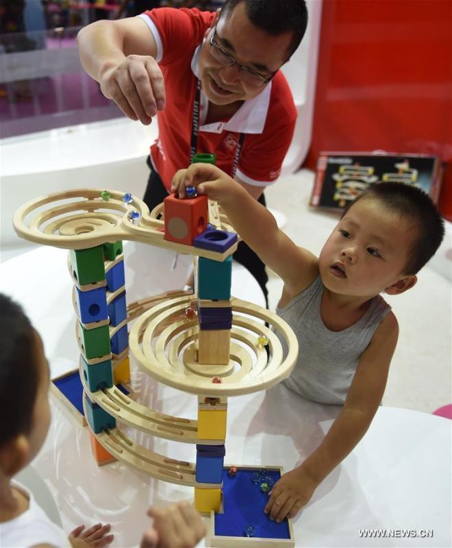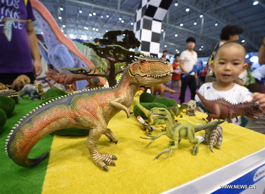 A child plays with a toy dinosaur at the 7th China international toy educational culture expo in Beijing, capital of China, July 14, 2016. More than 100 brands from over 20 countries and regions took part in the 4-day event that kicked off at the National Agriculture Exhibition Center in Beijing on Thursday. (Xinhua/Luo Xiaoguang)