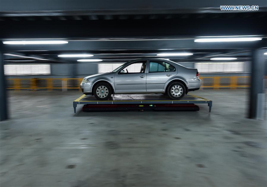 An AGV parking robot carrying a car moves at a robot company in Shenzhen, south China's Guangdong Province, July 15, 2016. An AGV robot, or Automated Guided Vehicle robot, has become an Internet hit recently in China. With the help of an AGV robot, people only need to drive their car onto a platform at the entrance of a parking lot. The robot, which could use laser navigation technology, will transfer the car into a carport in about two minutes. Car owners could also retrieve their cars through app in about two minutes. (Xinhua/Mao Siqian)