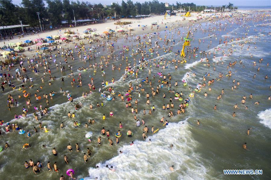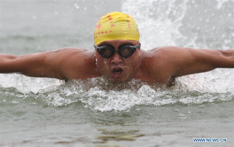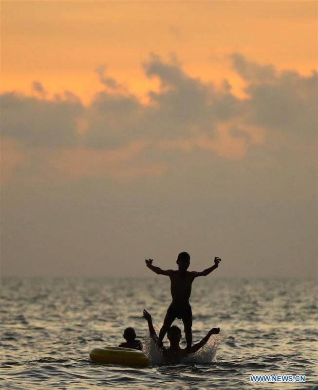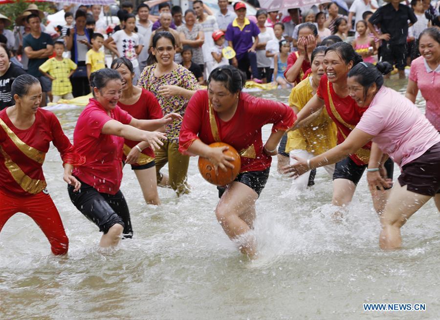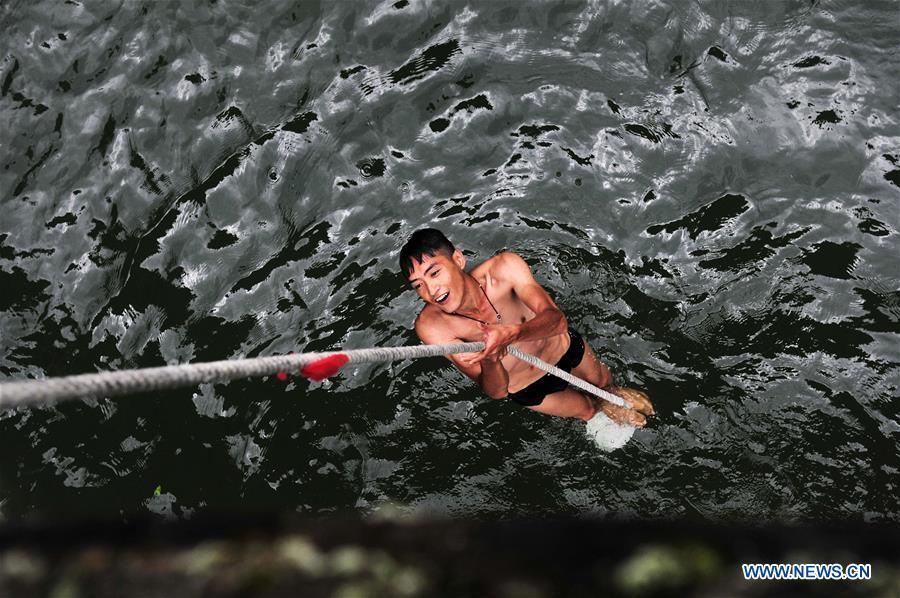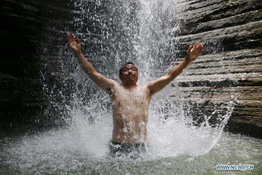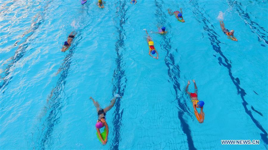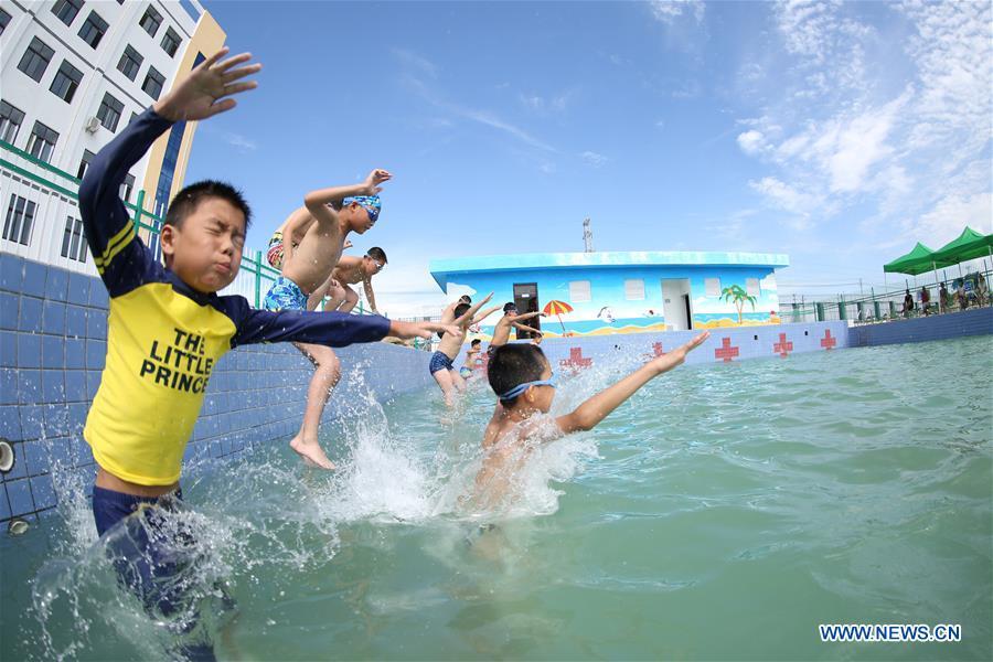 Children jump into water at a gym center in Yangxian County, northwest China's Shaanxi Province, July 17, 2016. (Photo:Xinhua/Wang Chuanyuan)