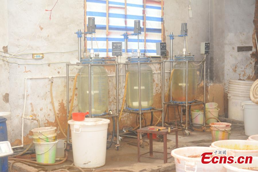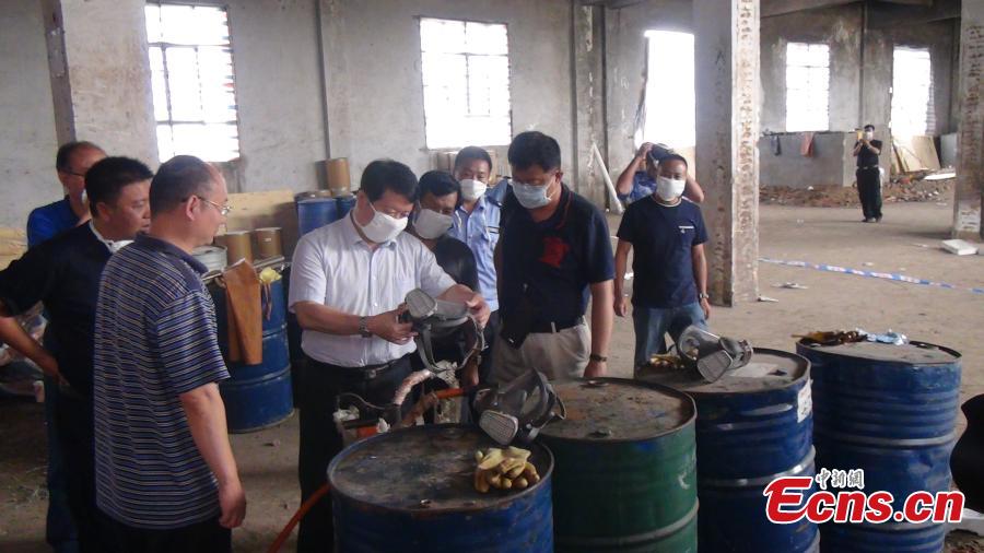 Drug manufacturing tools and materials at an abandoned fertilizer plant in Zhaotong City, Southwest China’s Yunnan Province, July 16, 2016. Local police have busted a drug making and trafficking ring, catching 15 suspects in Yunnan, Fujian and Henan province and confiscating 2.36 tons of ephedrine, the largest amount ever seized in the province. (Photo provided to China News Service)