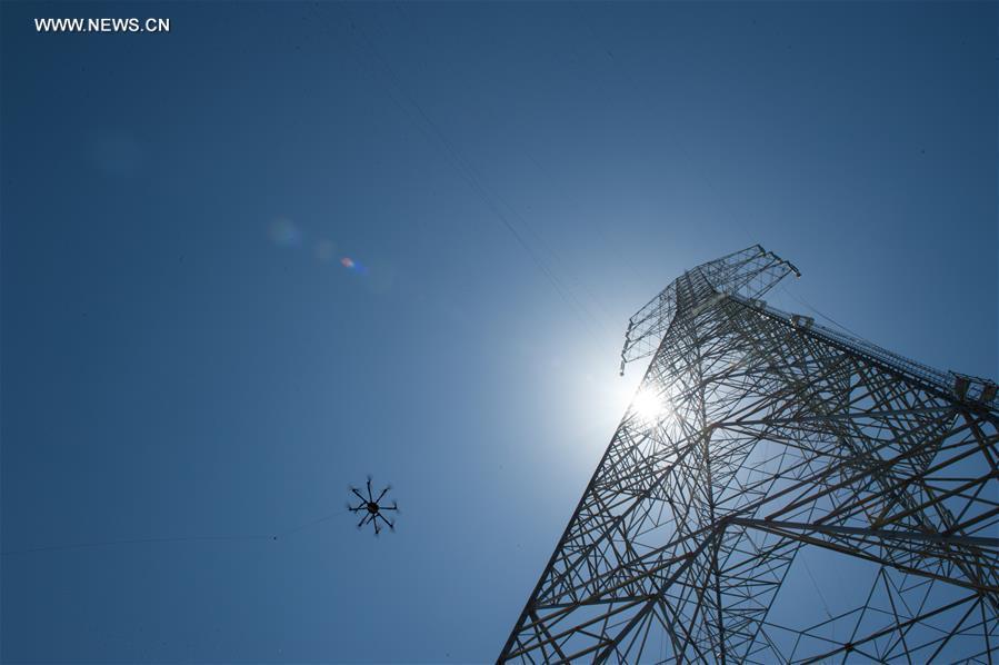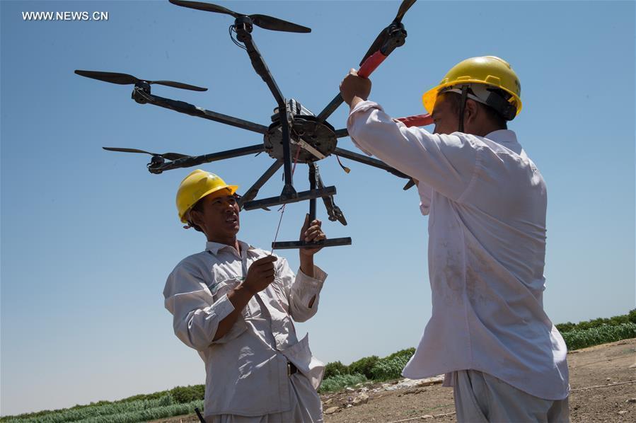 Workers from China Electric Power Equipment and Technology Co. Ltd (CET) prepare a drone for stringing the wire between power gird towers across the Nile River at Beni Suef Governorate, Egypt, June 30, 2016. Along the Nile River, the Egypt EETC 500kV Transmission Lines Project (EETC Project), a cooperative one between China Electric Power Equipment and Technology Co. Ltd (CET) and Egypt is under construction. The over-650-million-dollar EETC Project, which covers almost the whole area of the Nile River delta, is the largest transmission lines project in Egypt's history. (Xinhua/Meng Tao)