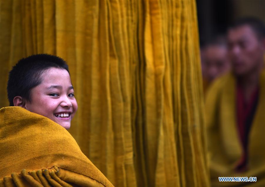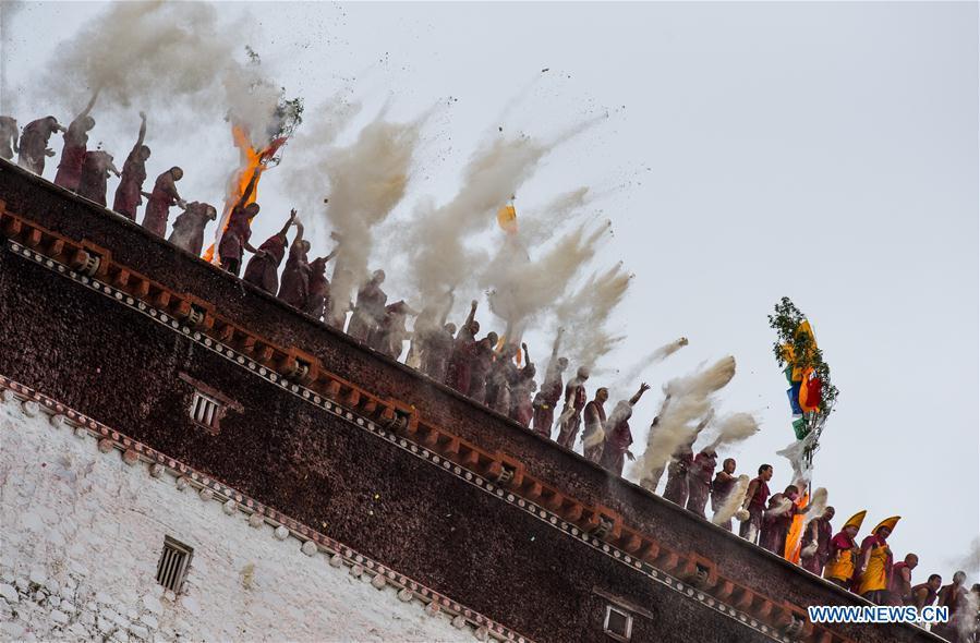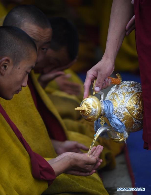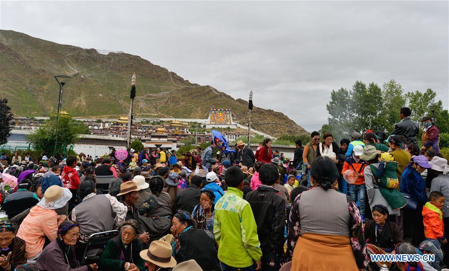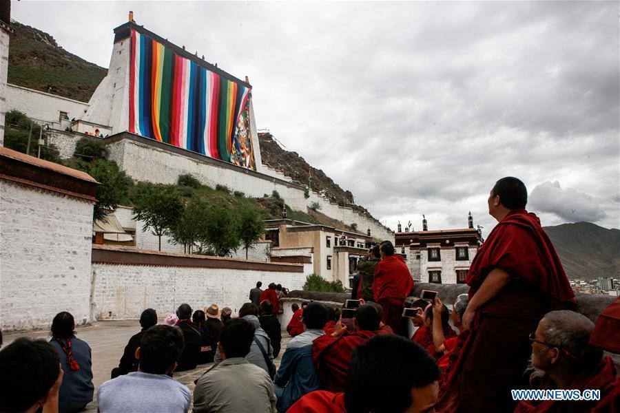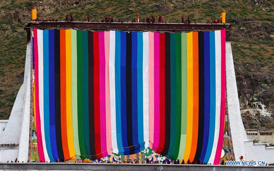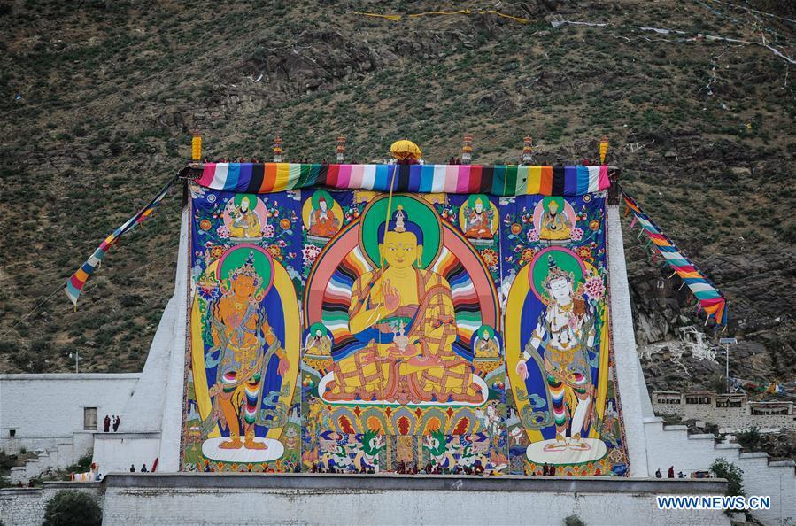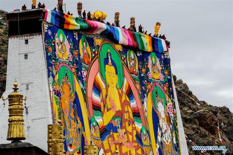 A huge thangka picture is displayed during the unveiling of the Buddha event at the Zhaxi Lhunbo Lamasery in Xigaze, southwest China's Tibet Autonomous Region, July 20, 2016. The annual ceremony was concluded here on Wednesday. (Xinhua/Purbu Zhaxi)