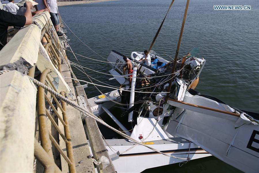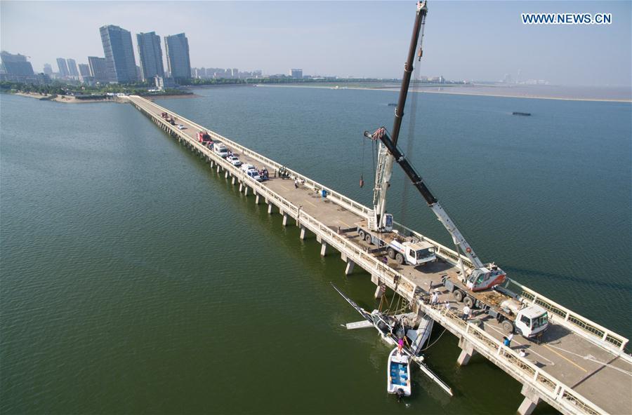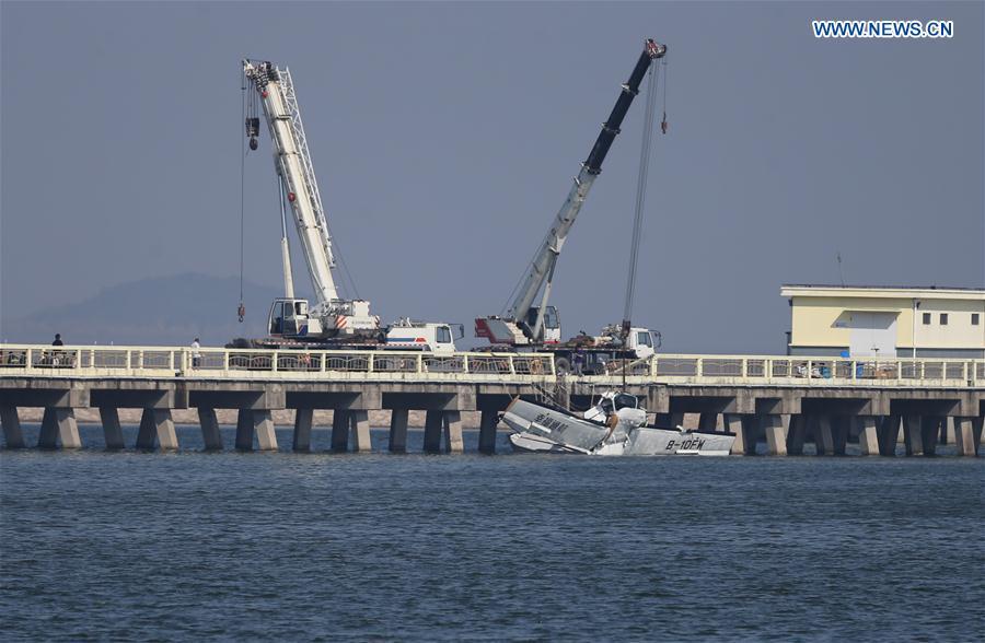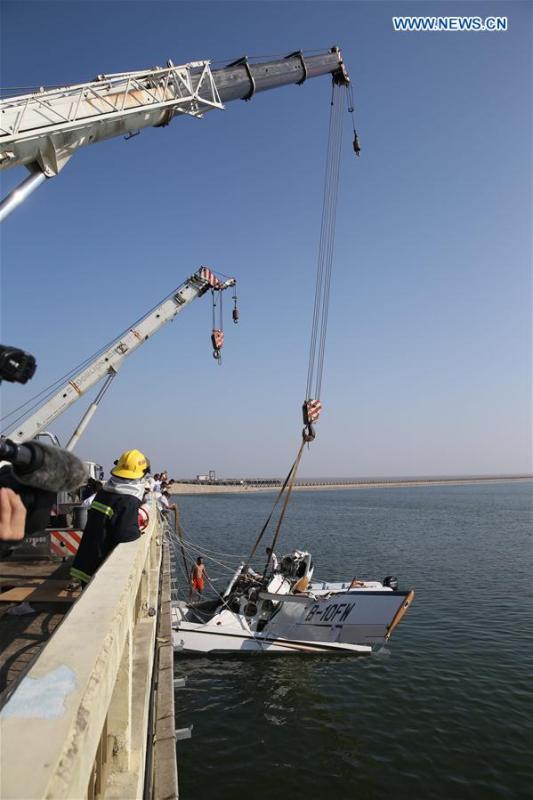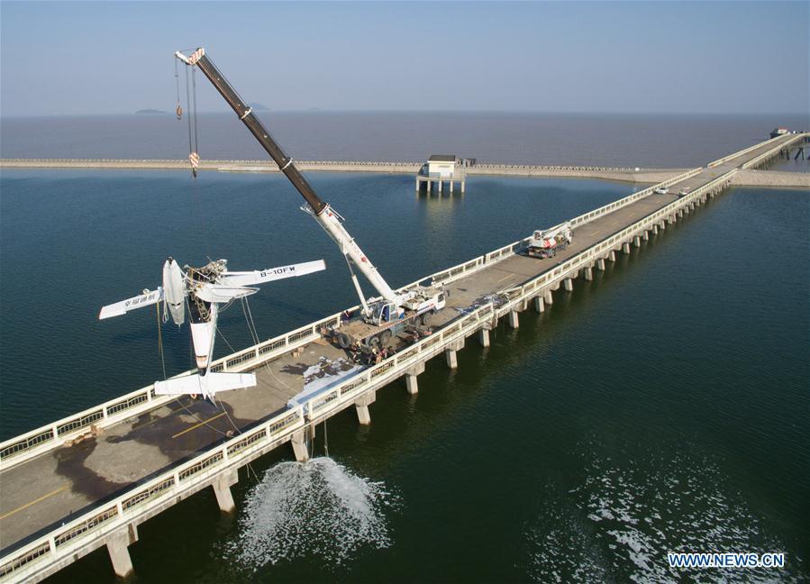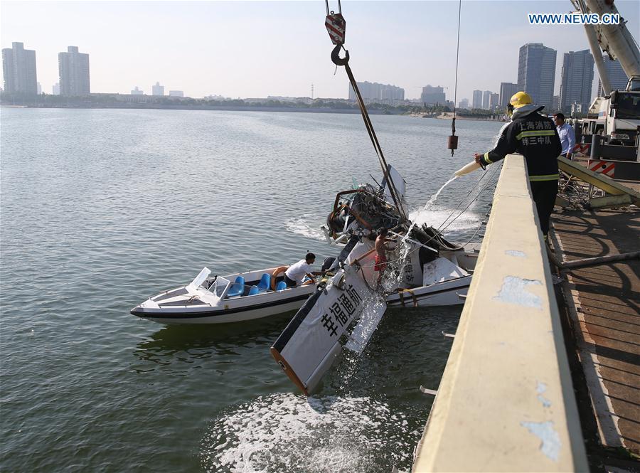 Photo taken on July 20, 2016 shows the wreckage of an amphibian plane being retrieved from the water by a crane in Shanghai, east China. Five people were killed when an amphibian plane hit a bridge in Shanghai on Wednesday, a local hospital said. (Xinhua/Pei Xin)