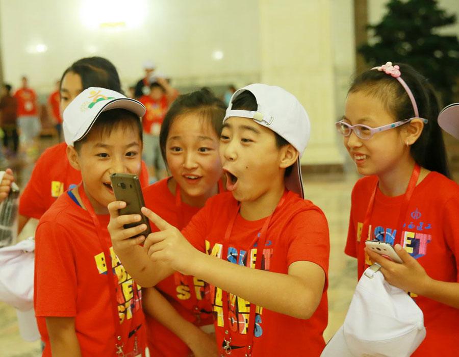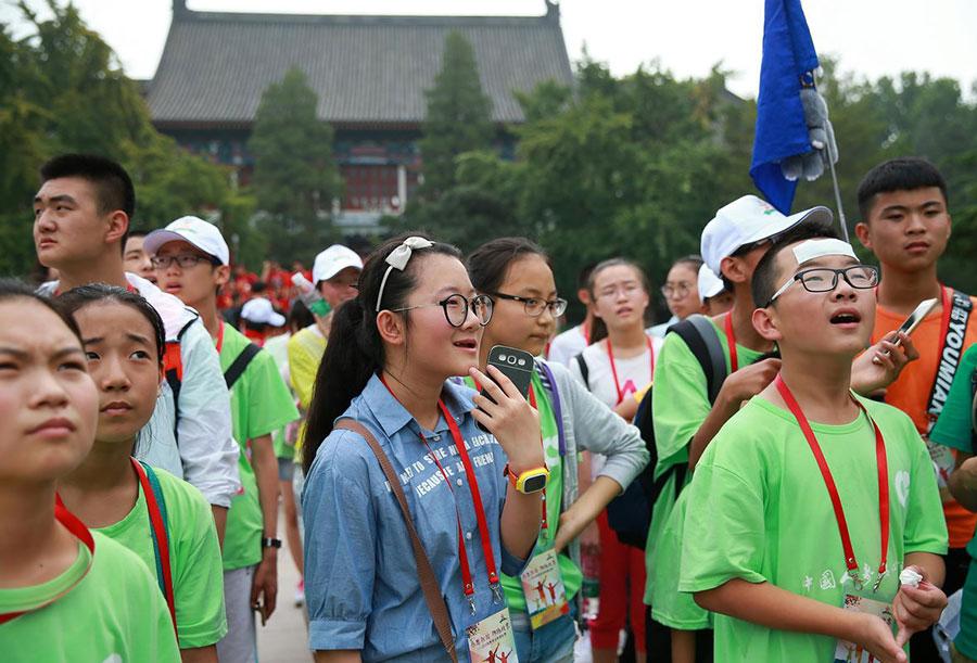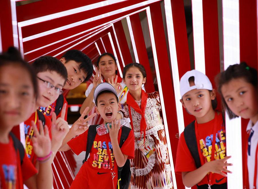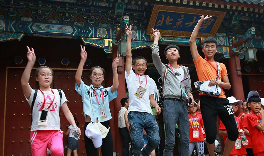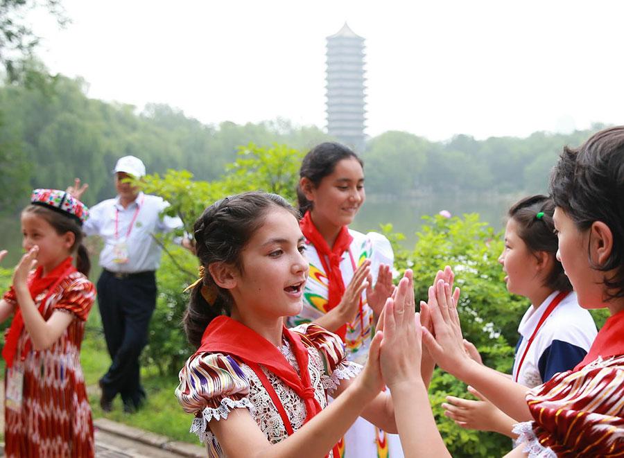 Ayigulzeli Turson, 11, from Xinjiang, plays a hand clapping game with a friend at Peking University on July 22, 2016. She translated a Uygur jingle into Mandarin and taught it to her playmates. A total of 217 left-behind children, 9 to 17 years old, from Heilongjiang and Shanxi provinces and Xinjiang region, were invited by the All-China Federation of Trade Unions to tour Beijing for a week, free. The parents of these children are migrant workers who've left their hometowns to earn money to support their families, so the youngsters end up with the moniker 'left-behind'children. (Photo/chinadaily.com.cn)