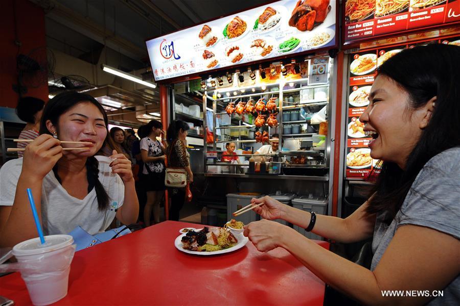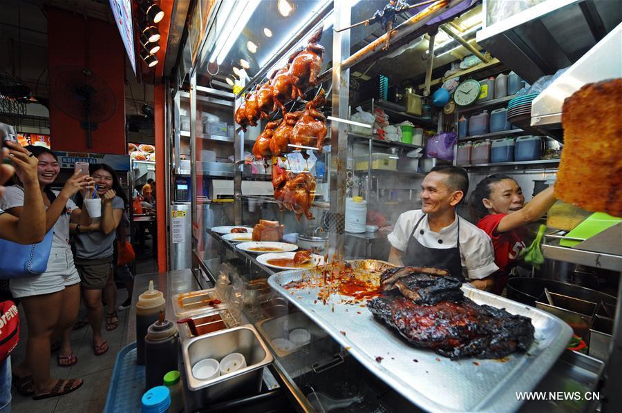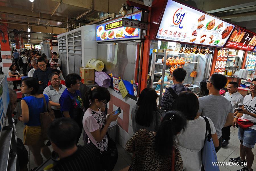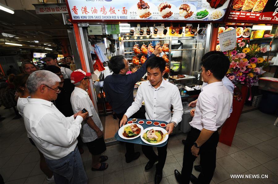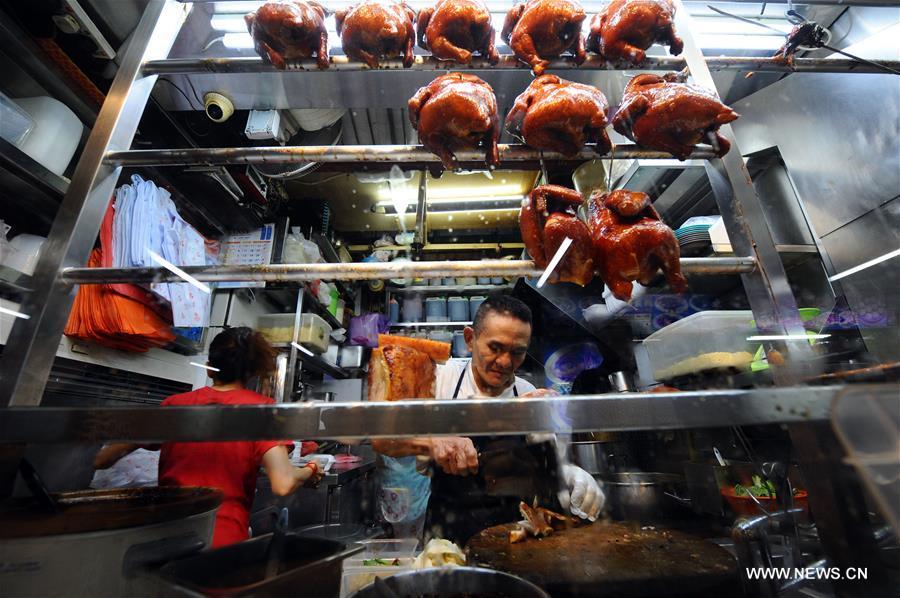 Chan Hon Meng (R), owner of the Hong Kong Soya Sauce Chicken Rice and Noodle hawker stall, prepares food in Singapore's Chinatown Complex, on July 22, 2016. Singapore hawker stalls Hill Street Tai Hwa Pork Noodle and Hong Kong Soya Sauce Chicken Rice and Noodle were awarded as one-star eateries in the Michelin Guide Singapore 2016 on July 21, 2016. This is the first time that Michelin includes hawker stalls in the list of the distinguished eateries. (Xinhua/Then Chih Wey)