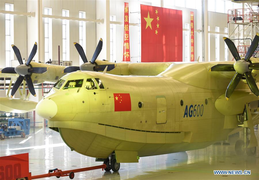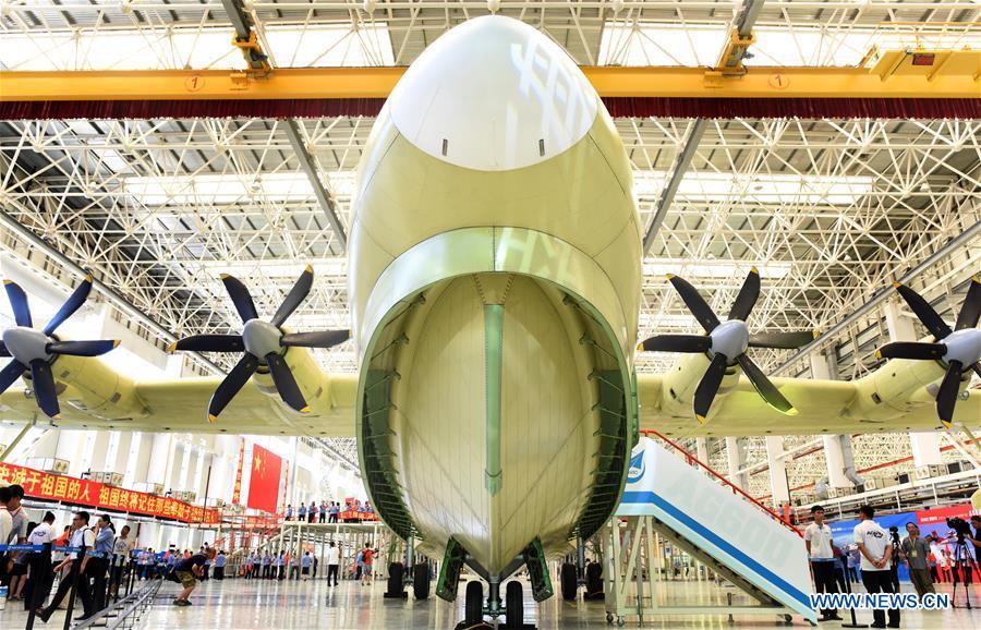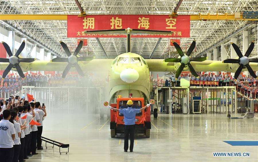 Amphibious aircraft AG600 rolls off a production line in Zhuhai, south China's Guangdong Province, July 23, 2016. The aircraft, which has a maximum take-off weight of 53.5 tonnes and a maximum flight range of 4,500 km, will be used to fight forest fires and perform marine rescue missions. The AG600 is by far the world's largest amphibian aircraft, about the size of a Boeing 737. (Xinhua/Liang Xu)