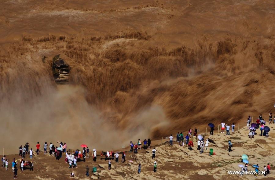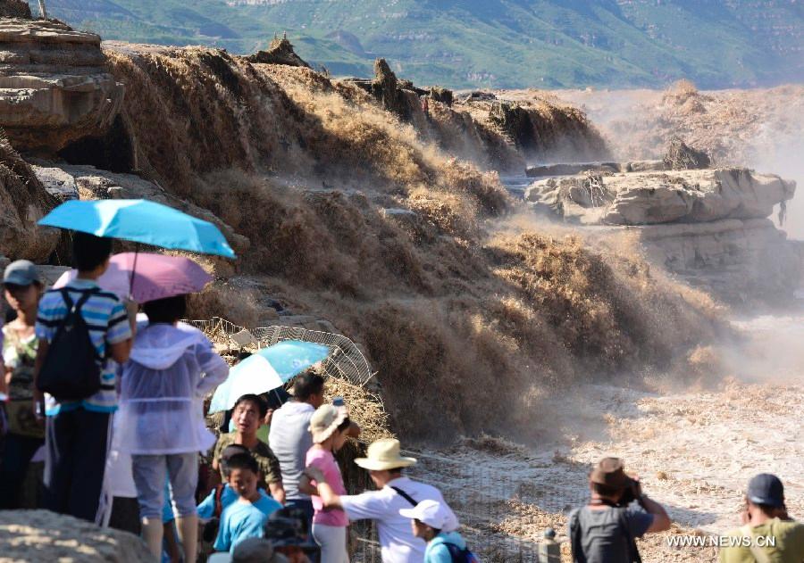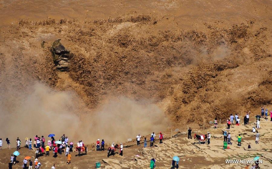 Tourists watch the Hukou Waterfalls on the Yellow River in Linfen, north China's Shanxi Province, July 21, 2016. The Hukou Waterfalls enter a summer flood period due to heavy rainfall in the upstream regions. (Photo/Xinhua)