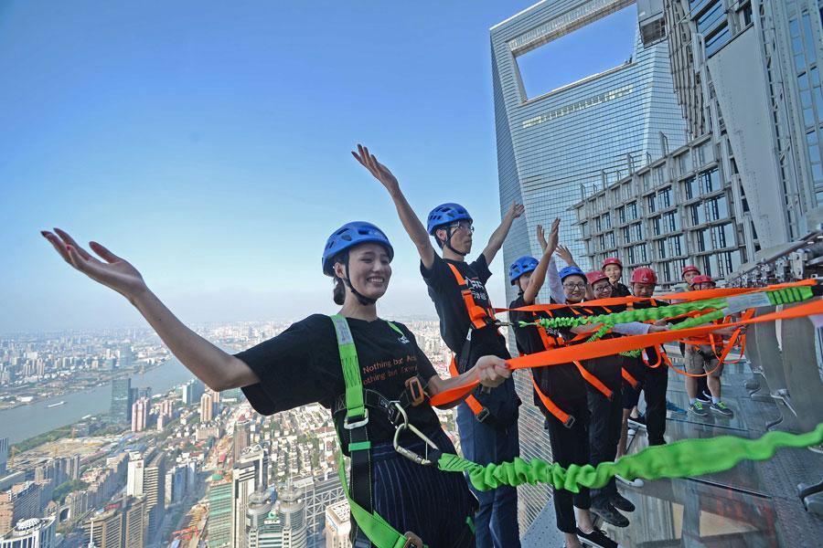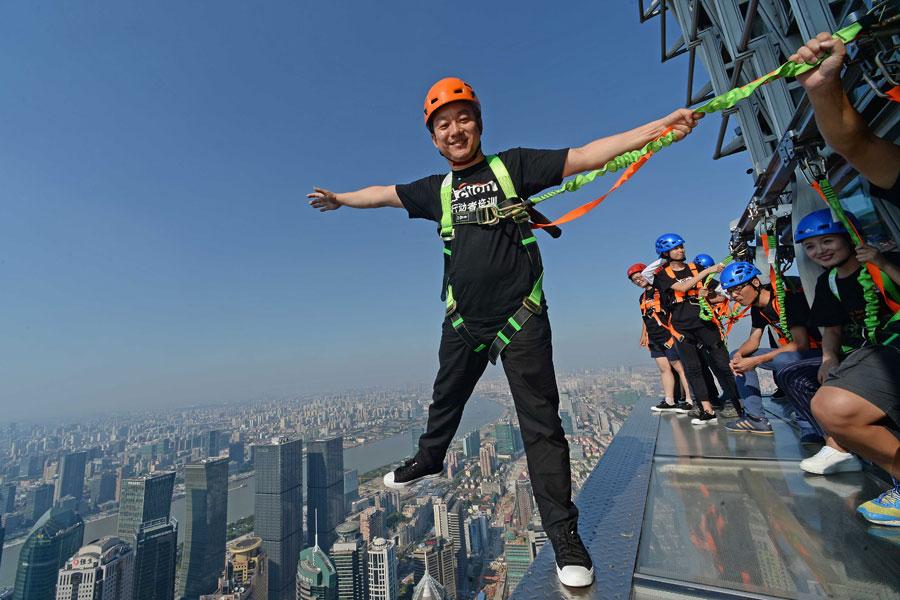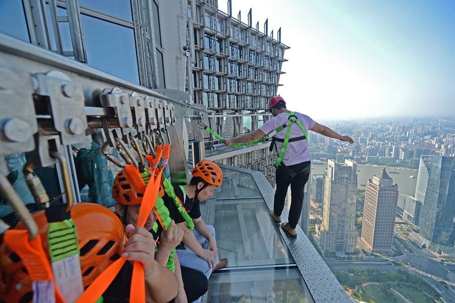 Want to walk in the air? Well you can by walking on the highest-ever guardrail-less glass skywalk outside the sightseeing hall of the 88-storied Jinmao Tower, one of the landmark skyscrapers in Shanghai. Standing at 340.6 meters high, the skywalk, which is 60 meters long and 1.2 meters wide, will open to public on Thursday. Visitors who want to walk on the skywalk reportedly have to sign a statement confirming they have enough physical and mental strength to take part in the activity, and that the activity will not do any harm to their physical and mental health.