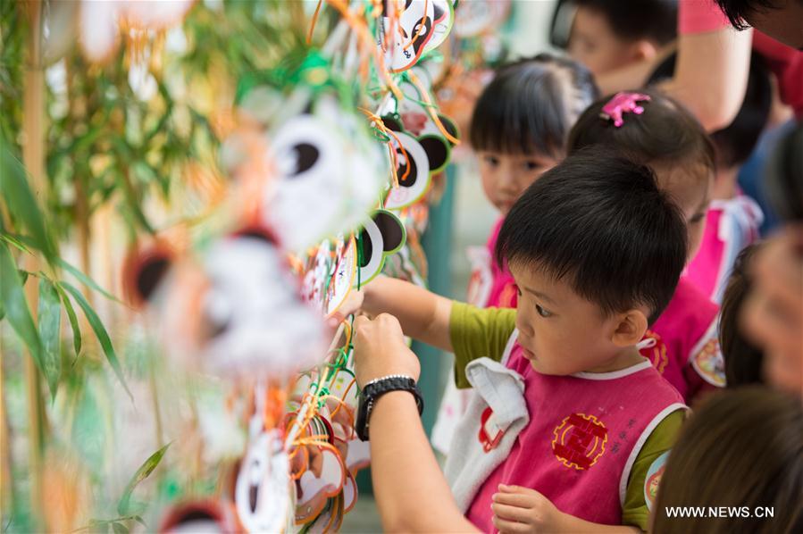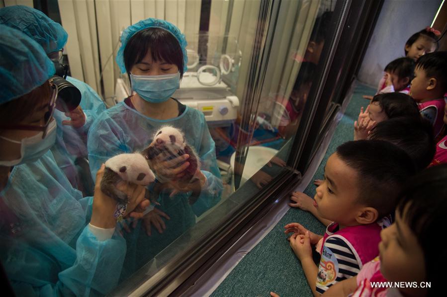 Photo taken on July 26, 2016 shows giant panda cubs Dabao (L) and Xiaobao in Macao Special Administrative Region, south China. The female panda Xinxin here gave birth to the twin cubs on June 26. A celebration for the twin cubs' completion of their first month of life is held here Tuesday. (Photo/Xinhua)