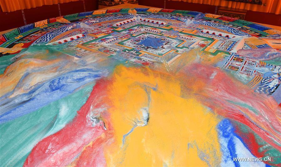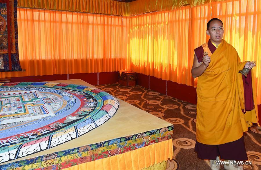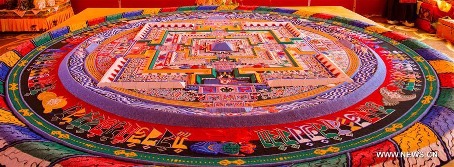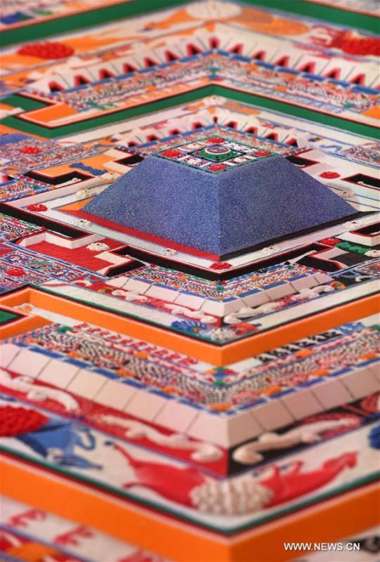 Photo taken on July 25, 2016 shows a colored sand mandala made by monks of Zhaxi Lhunbo Lamasery after Panchen Lama's first Kalachakra ritual in Xigaze, southwest China's Tibet Autonomous Region. The first Kalachakra ritual given by the 11th Panchen Lama Bainqen Erdini Qoigyijabu concluded on Sunday. The four-day Kalachakra (wheel of time) ritual was held in the New Palace of the Panchen Lama at the request of the monks of the Zhaxi Lhunbo Lamasery, the home temple of Panchen Lamas, in Xigaze. (Photo/Xinhua)