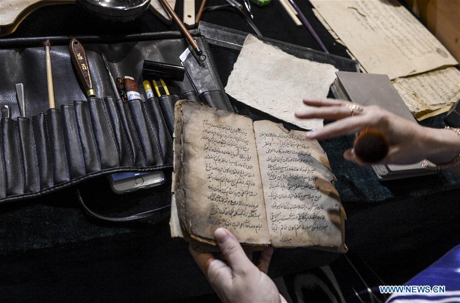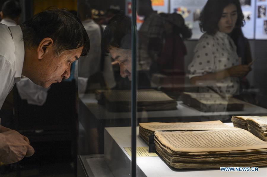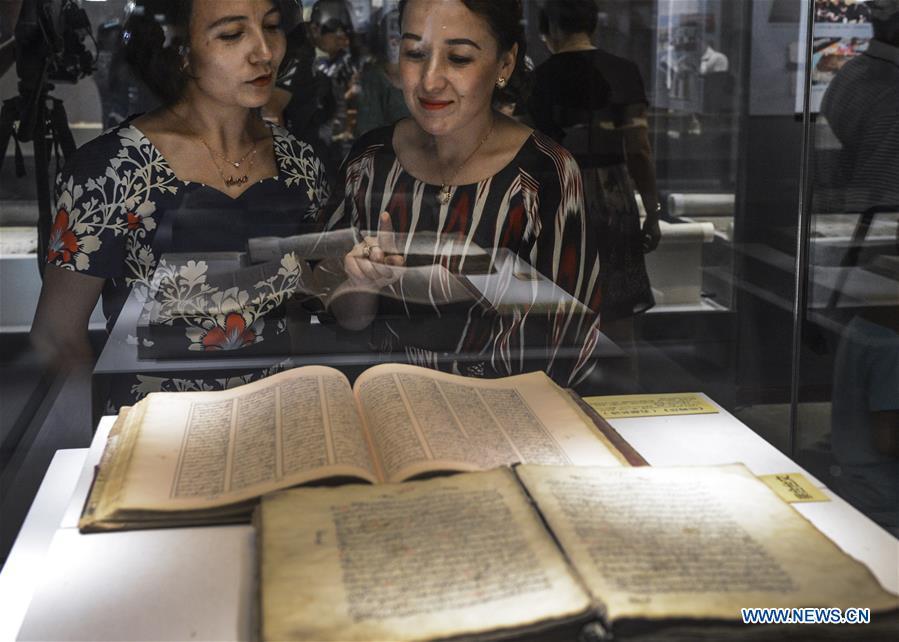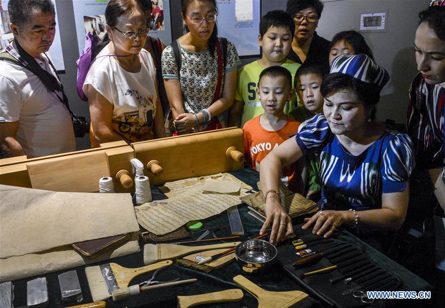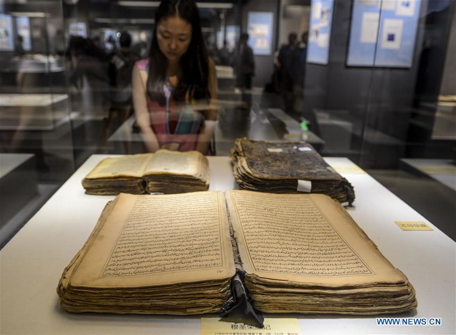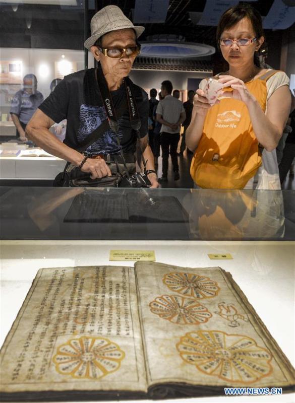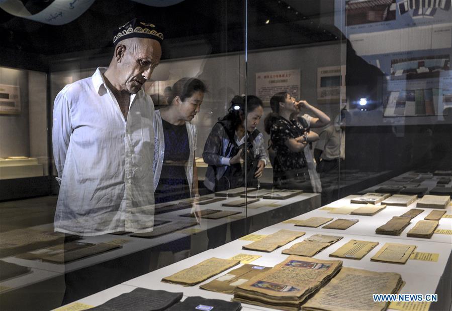 Visitors look at ancient books and documents of ethnic minorities in China displayed at Xinjiang Uygur Autonomous Region Musuem in Urumqi, capital of Xinjiang in northwest China, July 26, 2016. An exhibition displaying ancient books and documents of ethnic minorities in China kicked off here Tuesday. The exhibition, which would show material in languages of 21 ethnic groups in China, will last until Aug. 10. (Photo/Xinhua)
