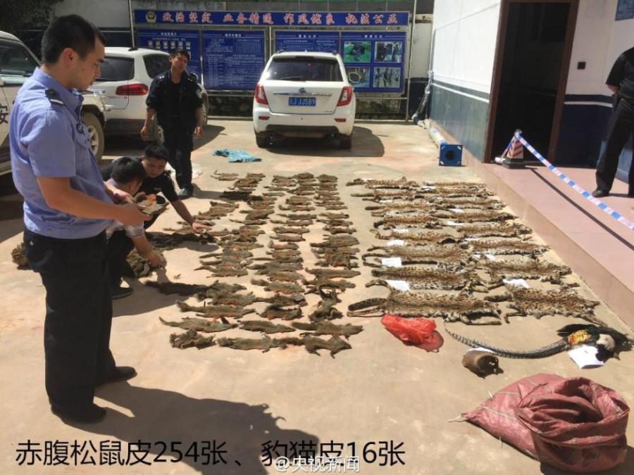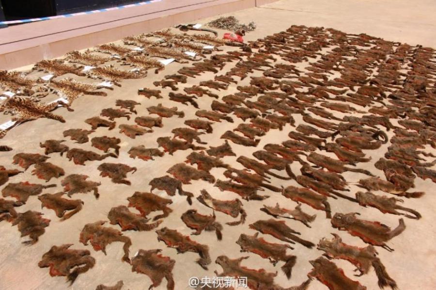Remains of wild animals under national protection seized by police are on display in Southwest China’s Yunnan Province. Police also confiscated a large quantity of ammunition and animal products, including 20 grams of river deer fur and 16 leopard cat hides, in a raid on an illegal trading and processing site for wild animals. (Photo/Weibo of CCTV)
