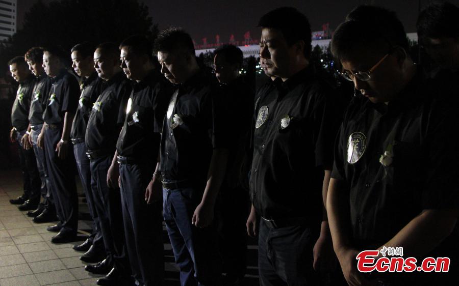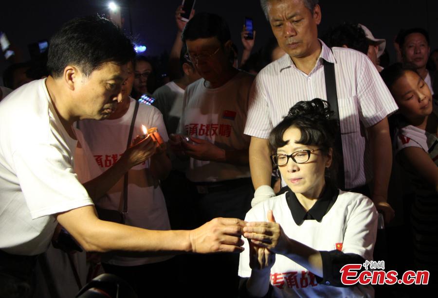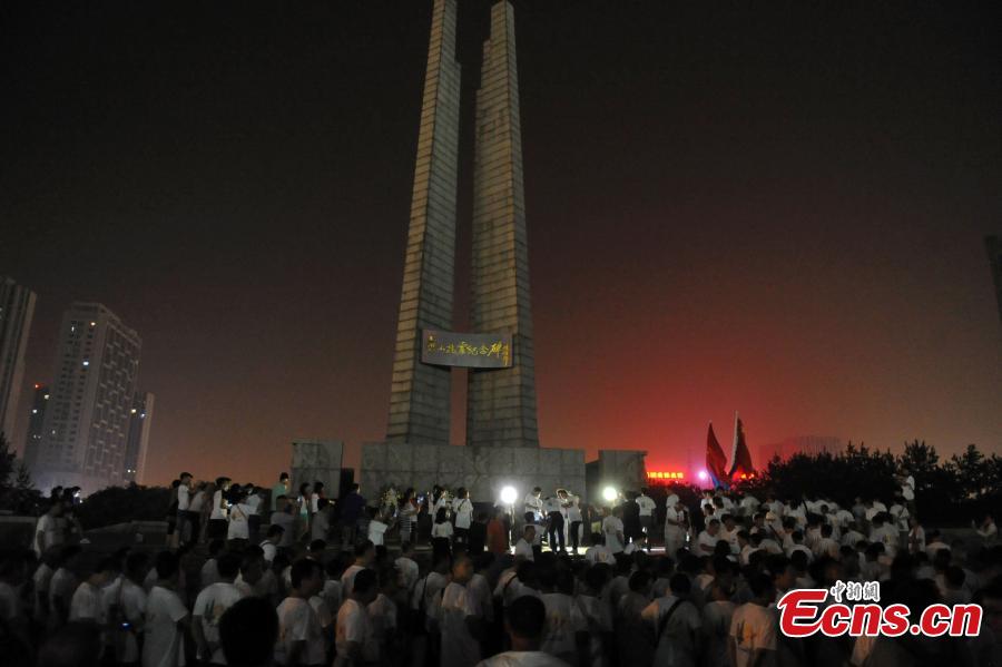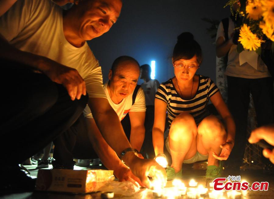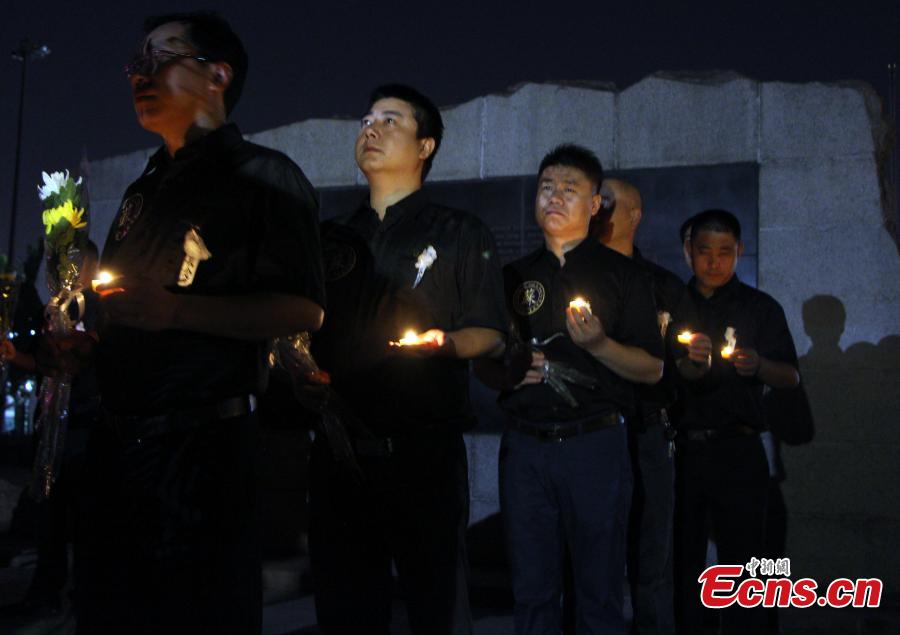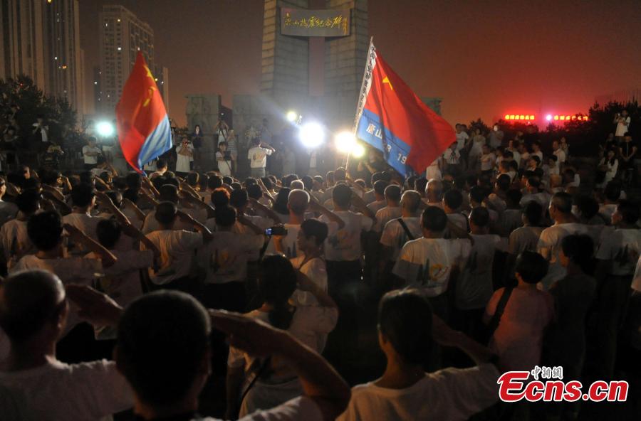 People mourn victims of the Tangshan Earthquake on its 40th anniversary in front of a monument in Tangshan City, North China’s Hebei Province, July 27, 2016. A magnitude 7.8 quake flattened Tangshan on July 28, 1976, claiming more than 242,000 lives and destroying virtually all public facilities. About 400 soldiers who participated in rescue efforts visited Tangshan for the anniversary. (Photo: China News Service/Zhai Yujia)