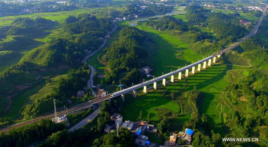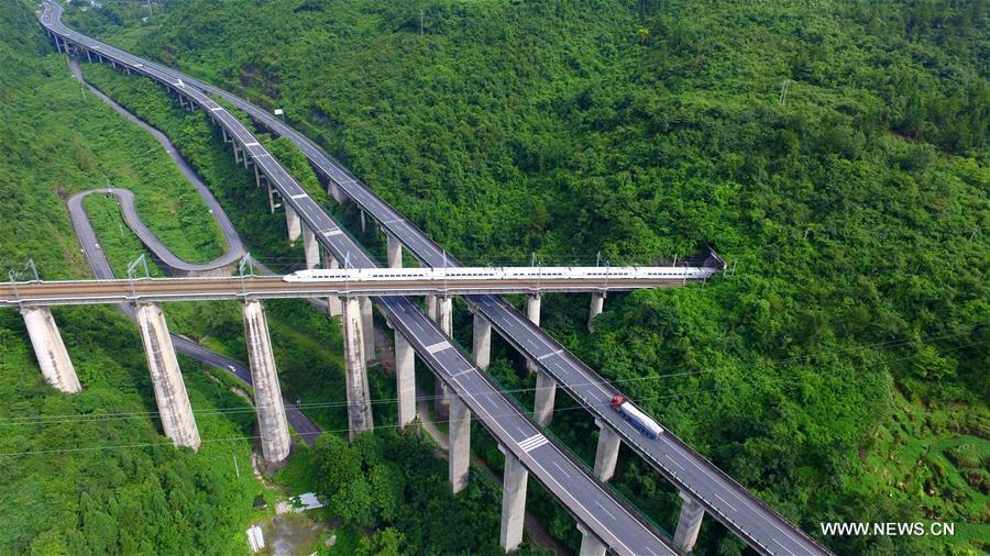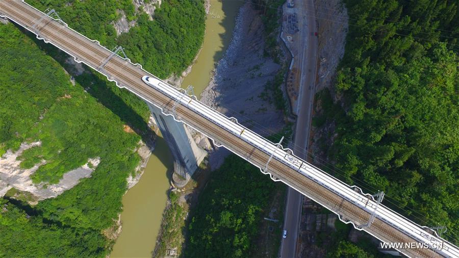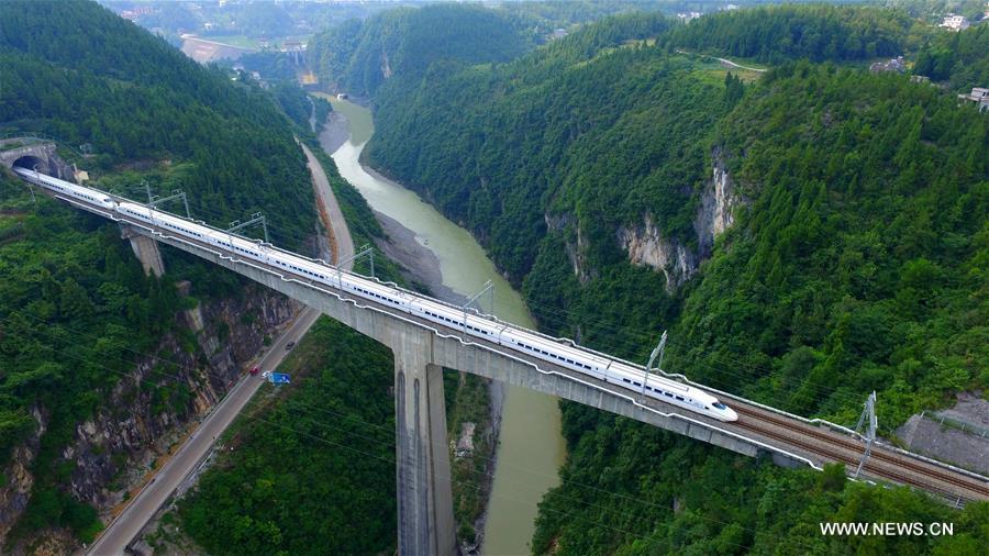 Photo taken on July 28, 2016 shows a high-speed train running on the Yichang-Wanzhou High-speed Railroad in Enshi, central China's Hubei Province. The 377-kilometer-long Yichang-Wanzhou Railroad winds through mountainous areas from its eastern station Yichang in Hubei Province to western station Wanzhou in southwest China's Chongqing. (Photo/Xinhua)
