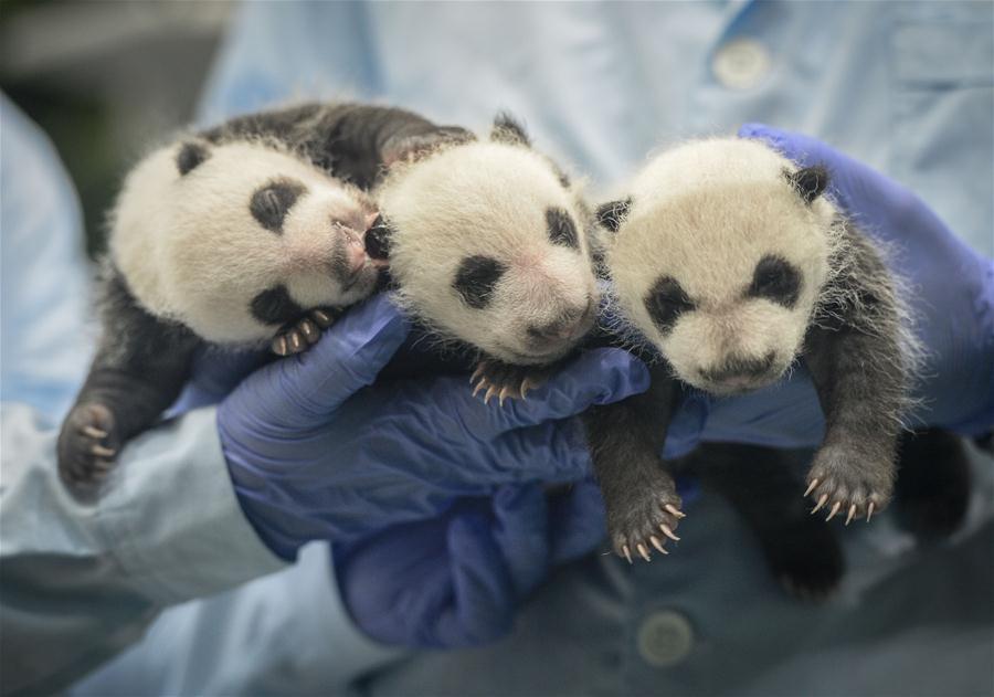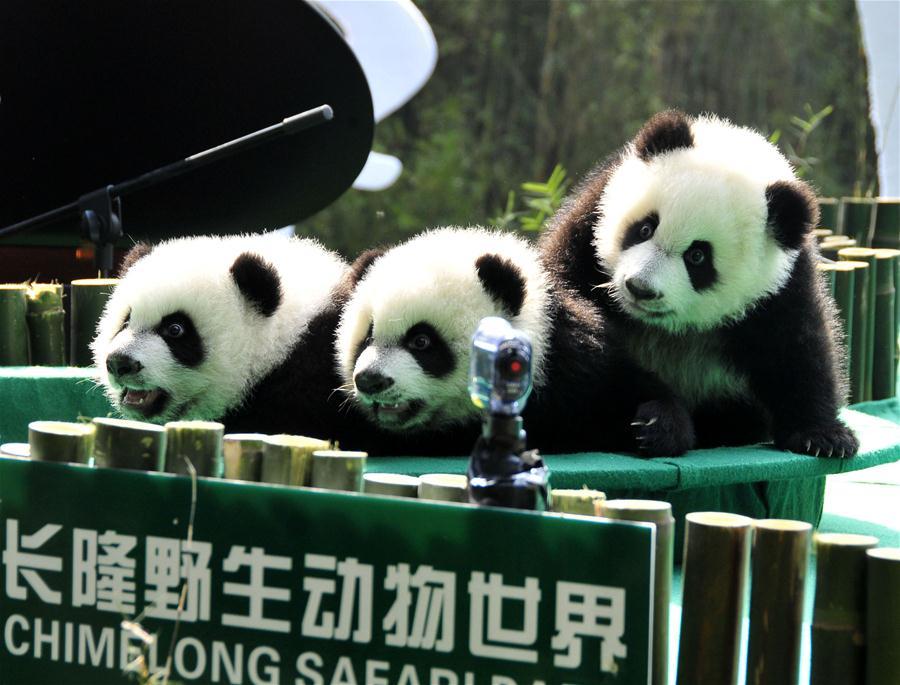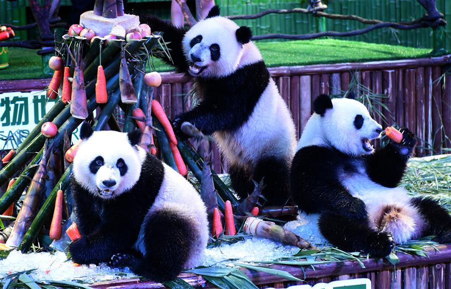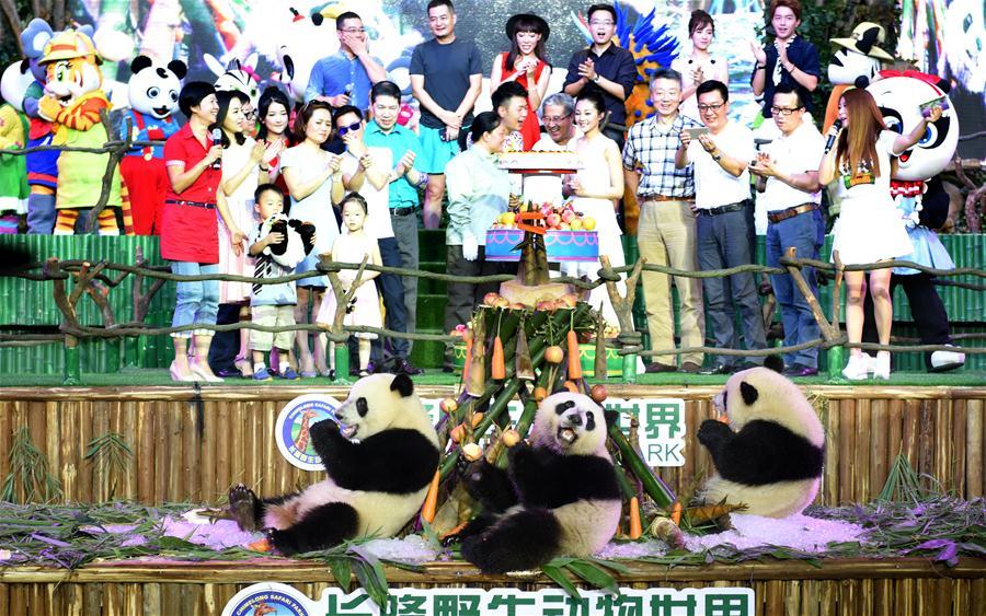 Giant panda triplets Mengmeng, Shuaishuai and Kuku eat bamboo shoots and carrots at their birthday party in in Guangzhou, capital of south China's Guangdong Province, July 29, 2016. A party celebrating the second birthday of the world's only surviving panda triplets, who were born on July 29, 2014 in Guangzhou, was held at Chimelong Safari Park Friday. (Photo: Xinhua/Lu Hanxin)