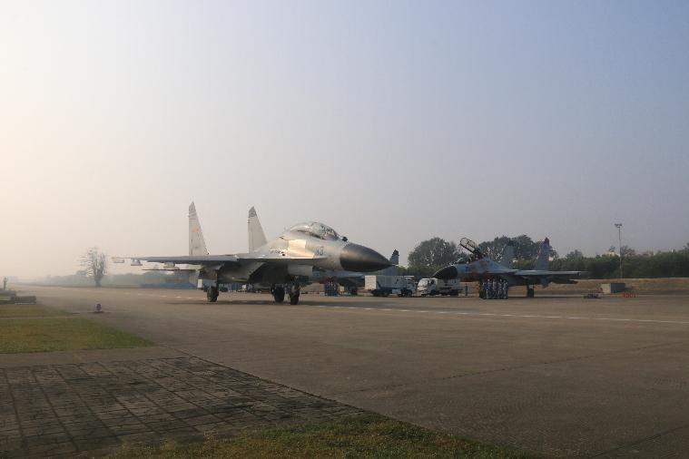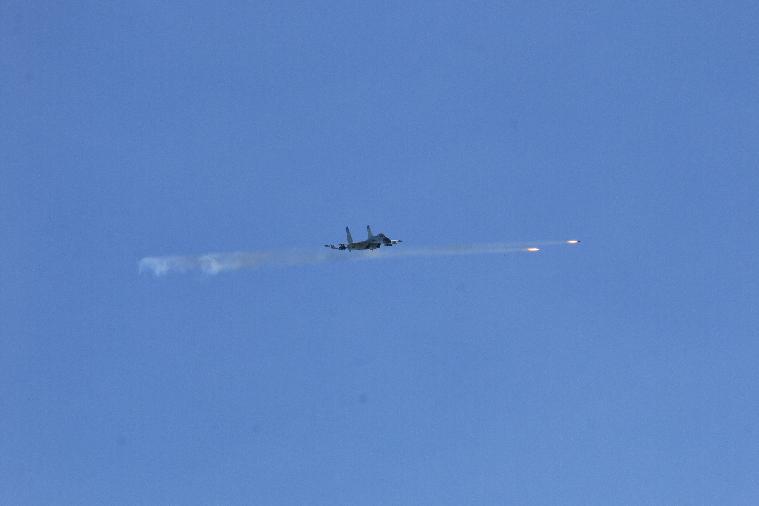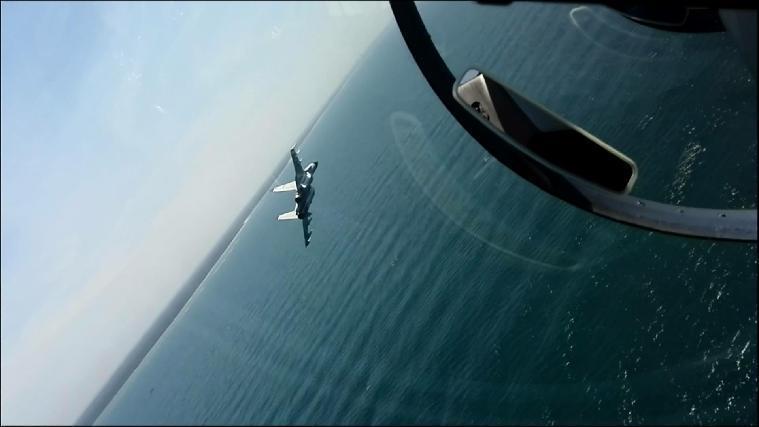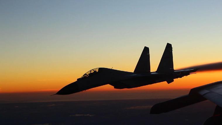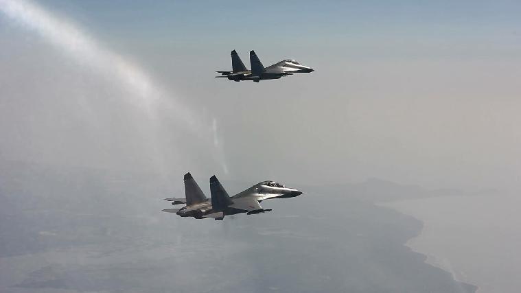 Two J-11 fighter jets fly in formation for a sortie during an air combat training exercise. An aviation division of the South China Sea Fleet with the PLA Navy organized its J-11 fighter jets to conduct an air combat training exercise recently in undisclosed waters in the South China Sea. (Photo/81.cn)