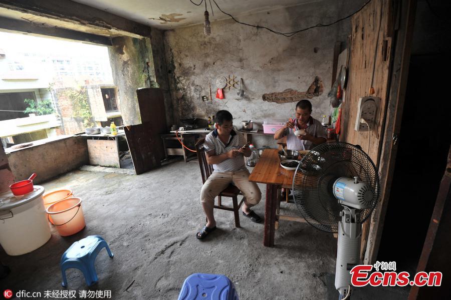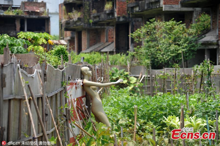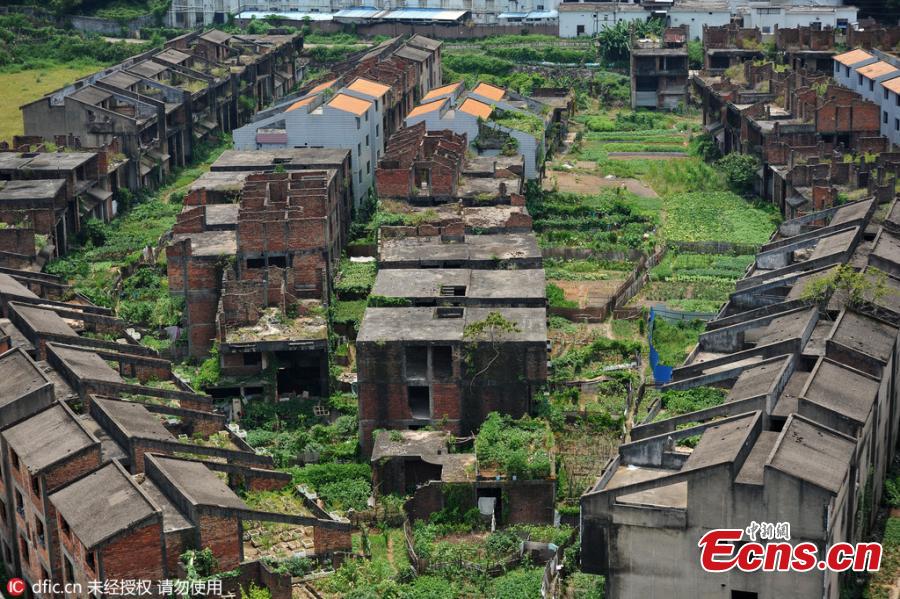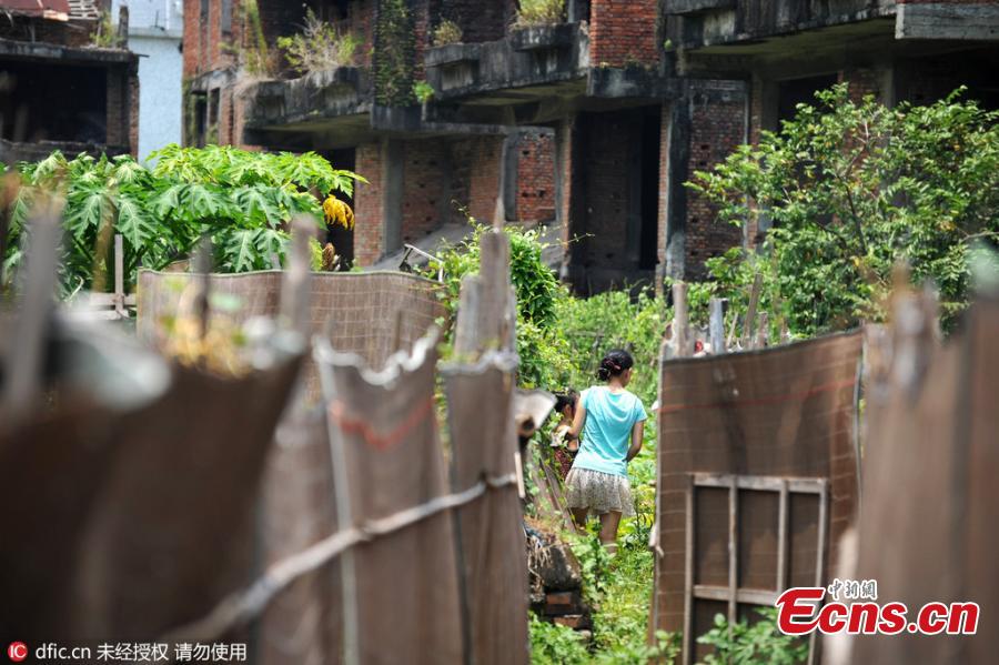 A view of unfinished villas in Longgang District, Shenzhen City, South China’s Guangdong Province, July 31, 2016. Construction on the real estate project of 124 villas started in 1992 and remained unfinished for the past 24 years. Local residents grow vegetables in some plots of land around the villas and some also live inside. (Photo/IC)