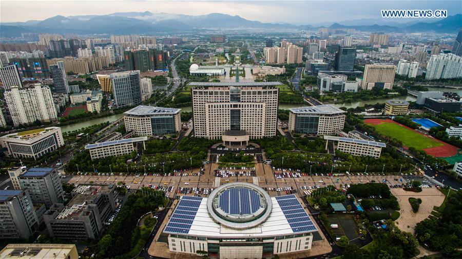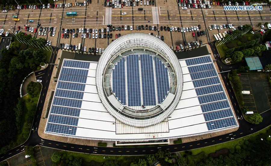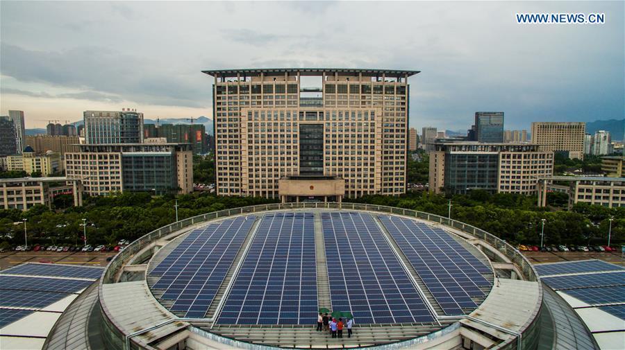 Photo taken on Aug. 3, 2016 shows solar panels installed on buildings of municipal government of Wenzhou, east China's Zhejiang Province. Covering 10,000 square meters in area, solar panels installed on buildings of the municipal government were put into use on Wednesday, which could generate electricity of 1.066 megawatts. (Photo/Xinhua)