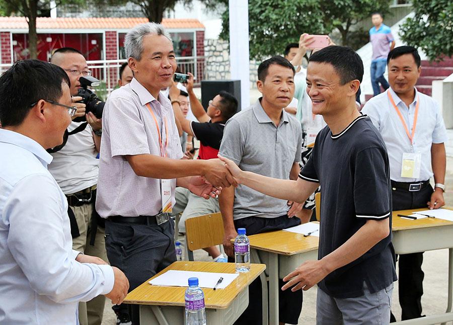 Jack Ma poses for group photo with teachers at an elementary school in Anshun, Guizhou province, Aug 3, 2016. (Photo/Asianewsphoto)