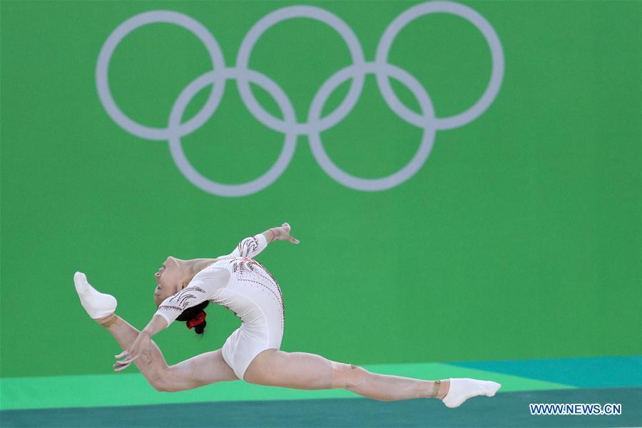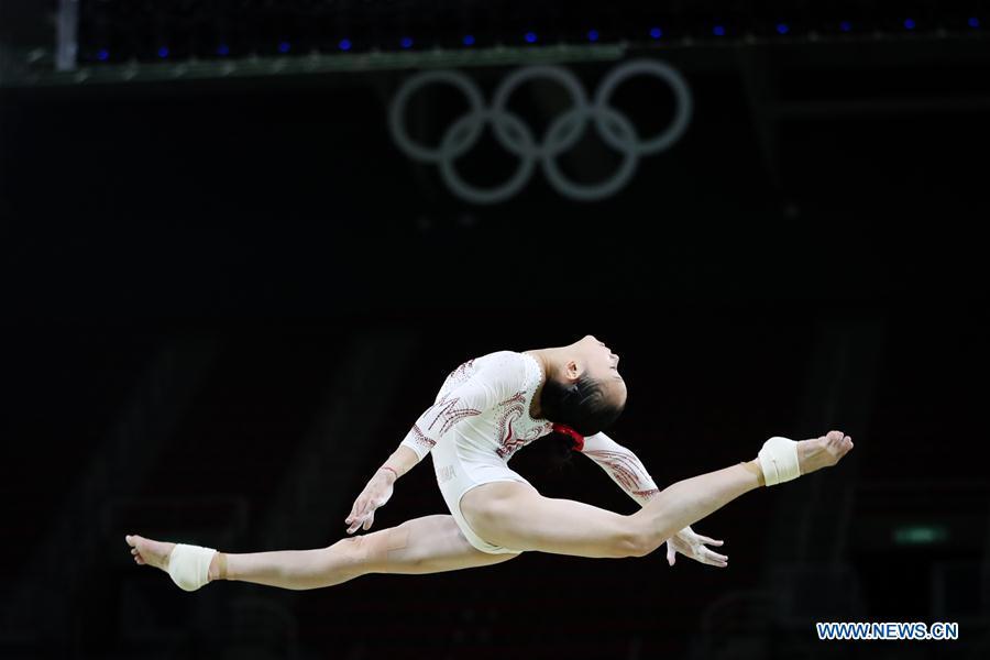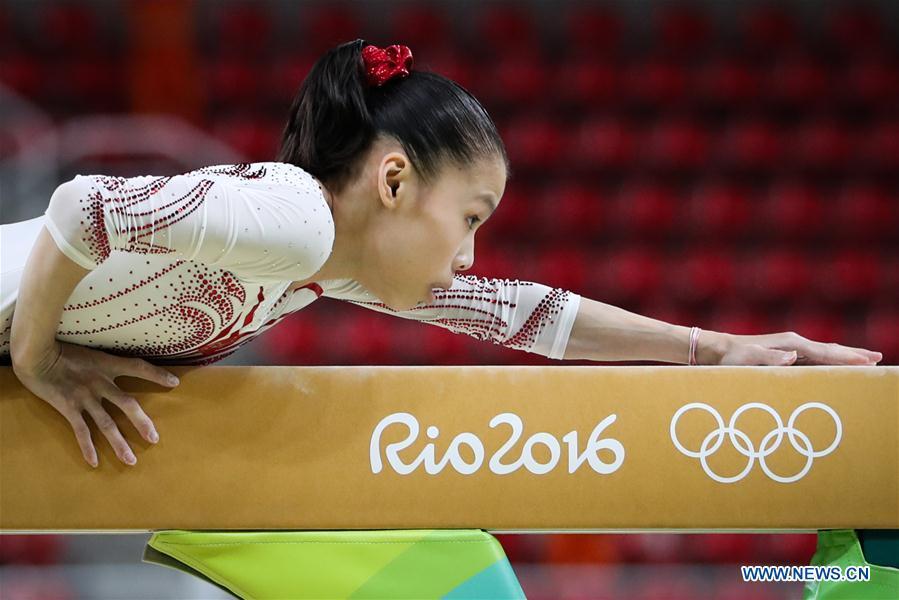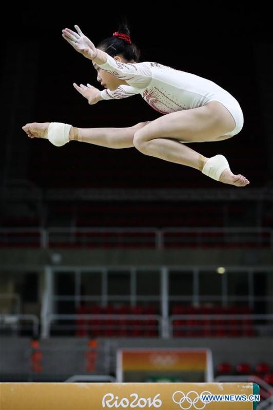 Chinese gymnast Fan Yilin acts during a training session at the Rio Olympic Arena in Rio de Janeiro, Brazil, on Aug. 4, 2016. Olympic gymnastics competitions are scheduled to start on Aug. 6. (Xinhua/Zheng Huansong)