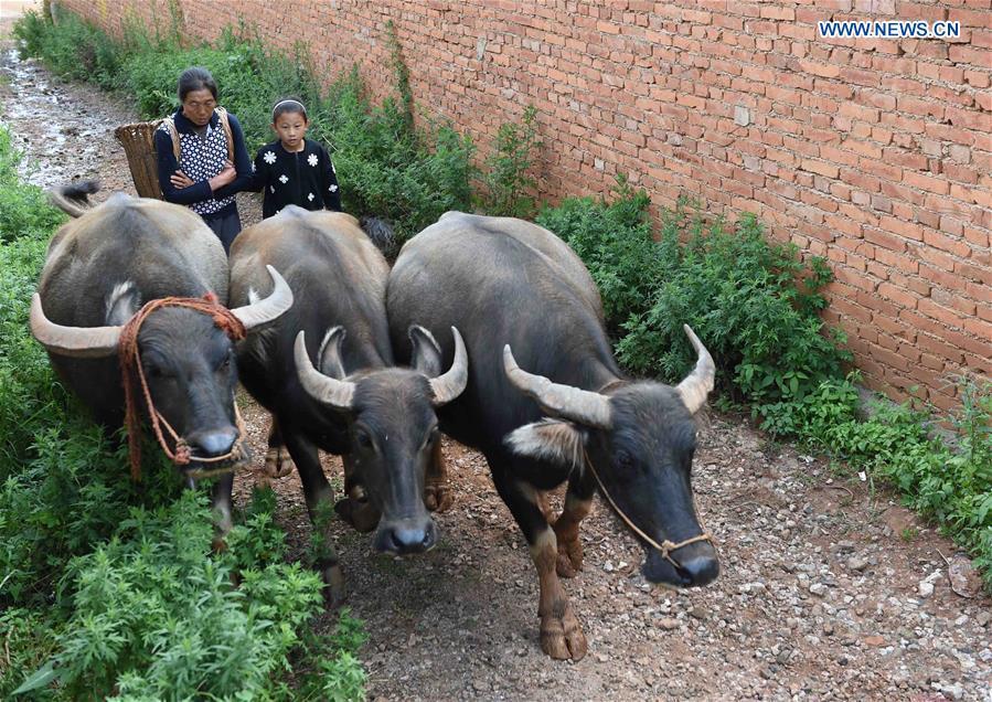 10-year-old He Yuanxi reads a book as she herds cattle in Fengle Village of Yangjie Township of Xundian country, Southwest China's Yunnan province, Aug. 2, 2016. He Yuanxi, a typical "left-behind child" in Chinese rural area, has been living with her 60-year-old grandmother as her father chooses to work in big cities after divorce. The girl, who just completed the fourth year study in primary school, helps her grandmother to do housework, herd cattle and do farm work in this summer vacation. The phrase "left-behind children" is used in China to describe rural children whose parents work in other cities. Left-behind children usually live with relatives, often their grandparents, while their parents work away from home. (Photo/Xinhua)