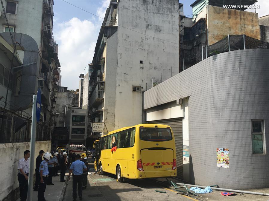 Photo taken on Aug. 8, 2016 shows the bus crash site in Macao, south China. At least 29 tourists from the Chinese mainland were injured and three seriously on Monday when a tour bus crashed into a building in Macao, police said. (Photo/Xinhua)