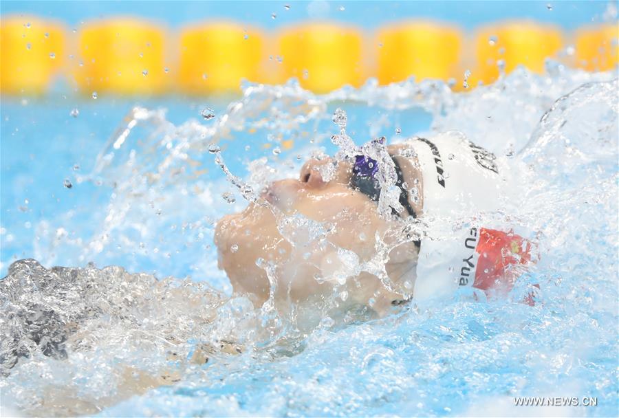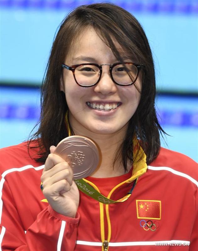 China's Fu Yuanhui competes during the women's 100m backstroke swimming final at the 2016 Rio Olympic Games in Rio de Janeiro, Brazil, on Aug. 8, 2016. Fu Yuanhui won the bronze medal with 58.76 seconds. (Photo/Xinhua)