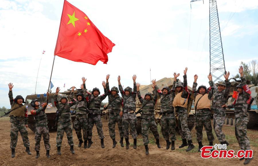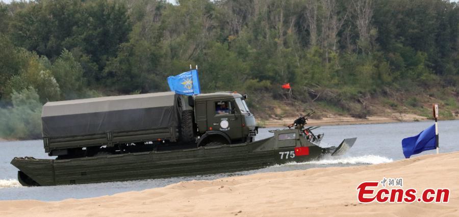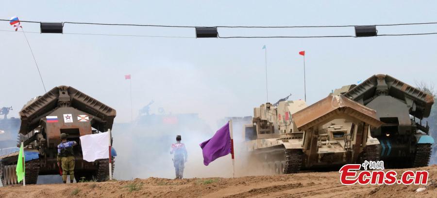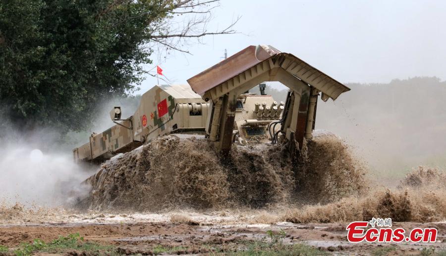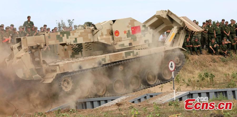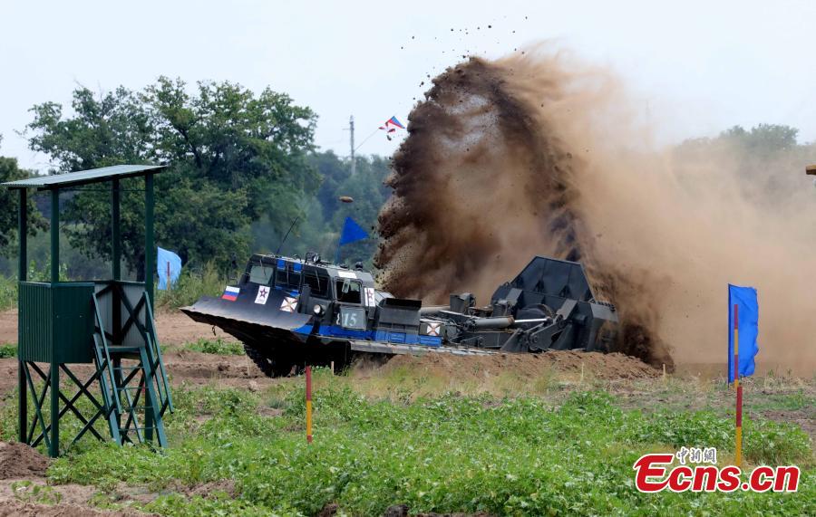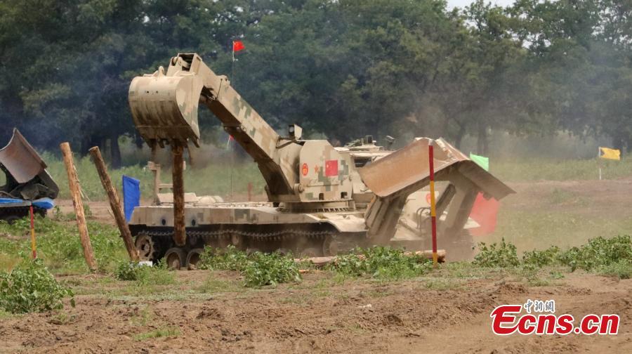 A Chinese multifunctional engineering vehicle of the PLA competes in the Engineering Formula competition among China, Russia and Kazakhstan in Volgograd, Russia, Aug. 9, 2016. The competition included tasks such as digging out a ditch and trench backfilling. (Photo: China News Service/Wang Xiujun)
