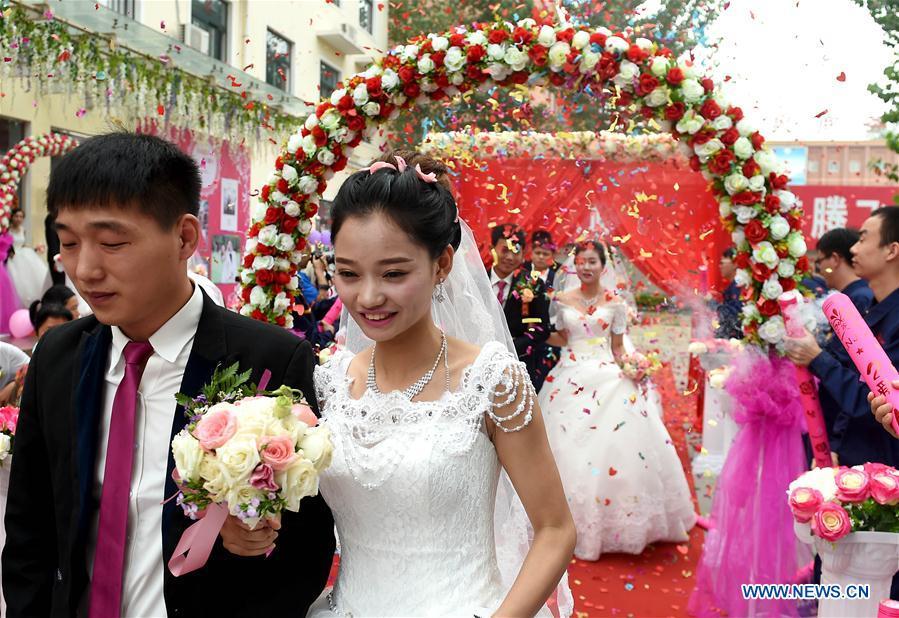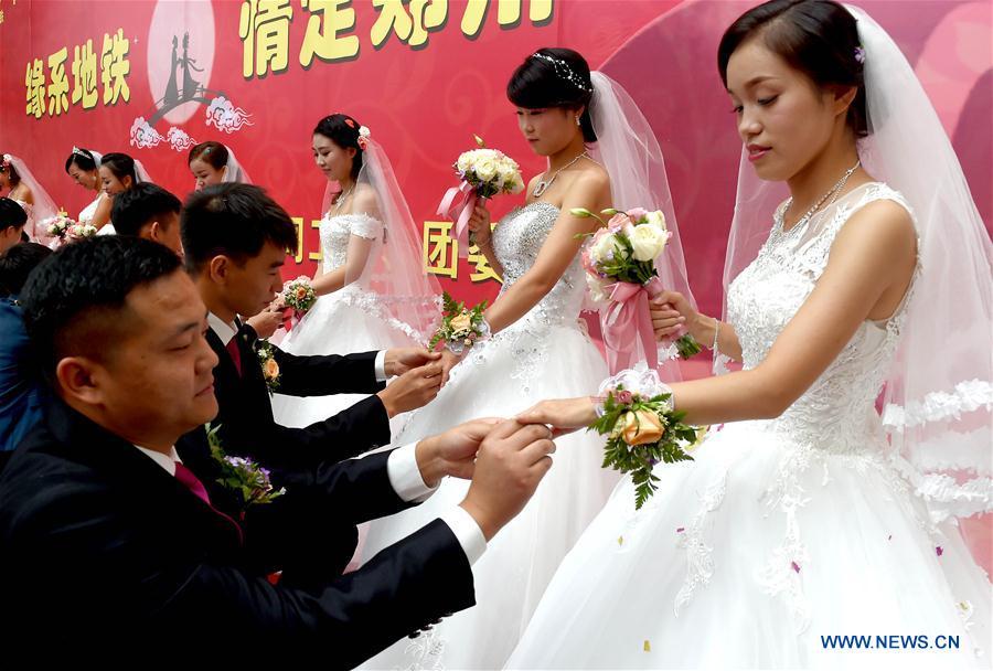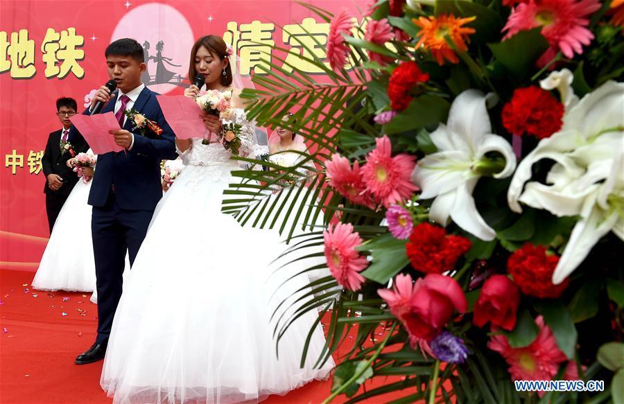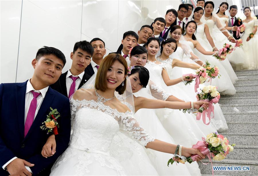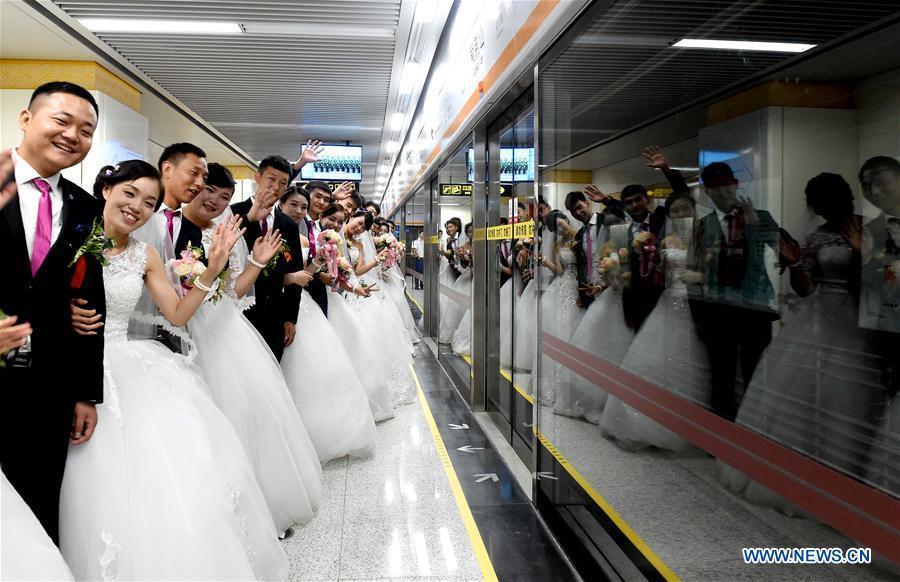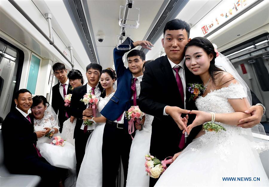 Newly-wed couples take selfies in a metro car in Zhengzhou, capital of central China's Henan Province, Aug. 9, 2016. A group wedding ceremony was held here for city metro constructors on Qixi Festival, or Chinese Valentine's Day. (Photo:Xinhua/Li An)