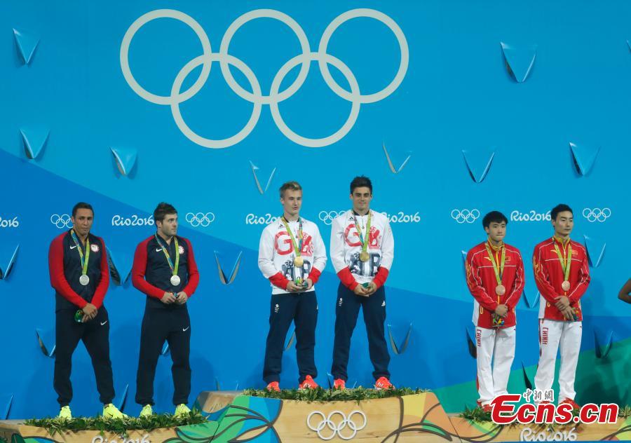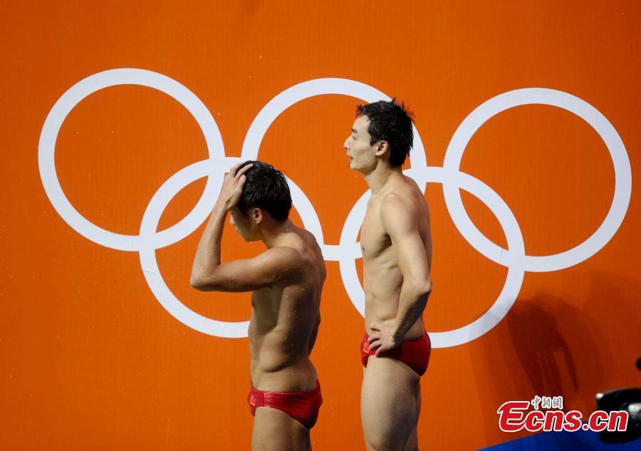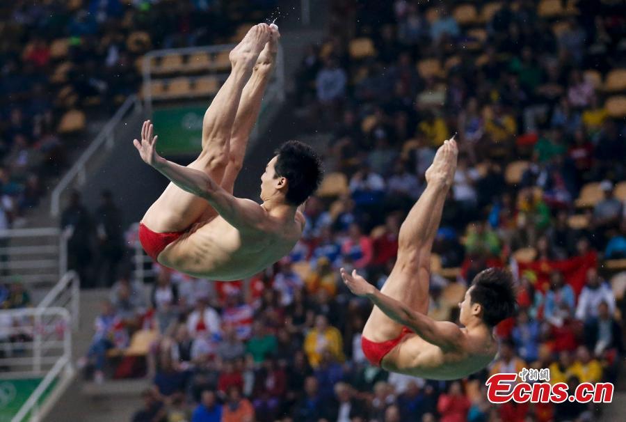 Qin Kai and Cao Yuan of China compete during the men's synchronised 3m springboard diving final at the 2016 Rio Olympic Games in Rio de Janeiro, Brazil, on Aug. 10, 2016. Qin Kai and Cao Yuan won the bronze medal. (Photo: China News Service/Du Yang)