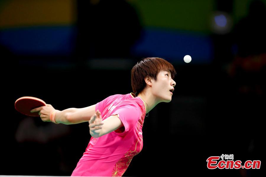 Ding Ning reacts after beating fellow Chinese player Li Xiaoxia during the women's singles gold medal match of table tennis at the Rio Olympics in Rio de Janeiro, Brazil, Aug. 10, 2016. (Photo: China News Service/Du Yang)