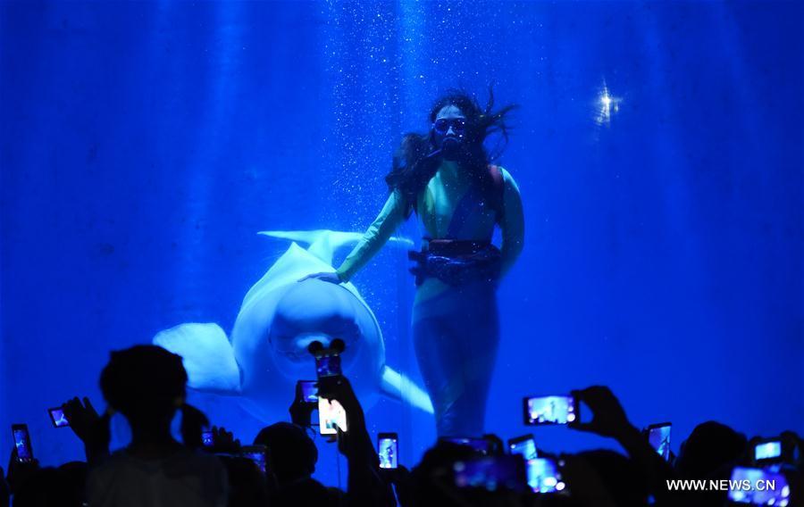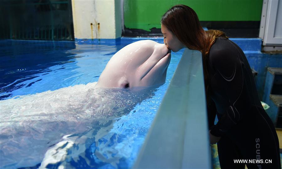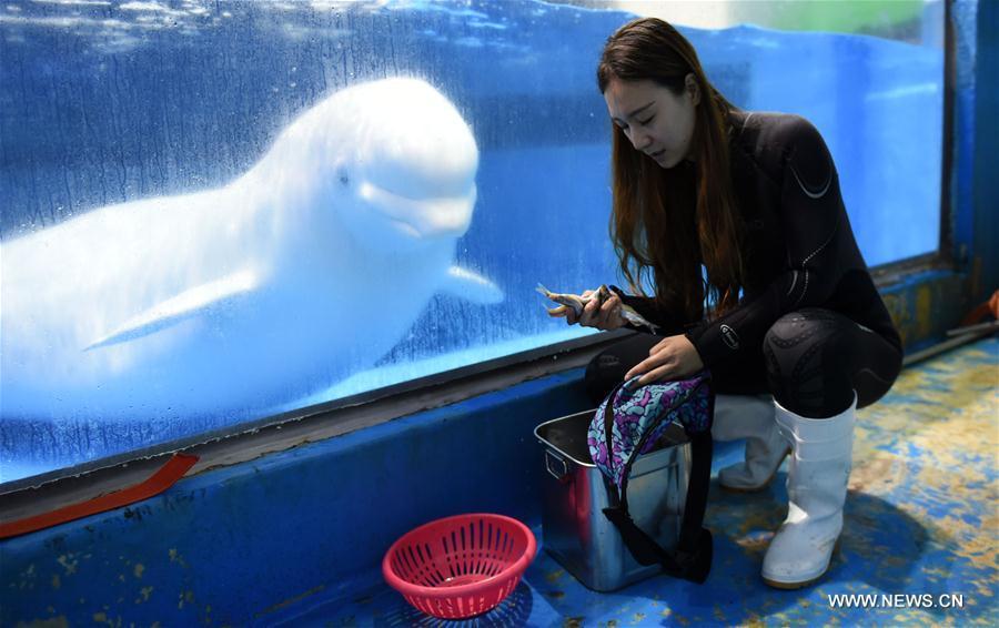 Trainer Liu Bingxue communicates with the beluga whale at Harbin Polarland in Harbin, capital of northeast China's Heilongjiang Province, Aug. 11, 2016. Liu Bingxue, a post-90's girl, became the beluga whale trainer two years ago. She starts her daily work with feeding and cleaning. She also takes charge of the whale's health examination. Her performances with the beluga whale are the most popular shows during the holidays at the Polarland. (Photo/Xinhua)