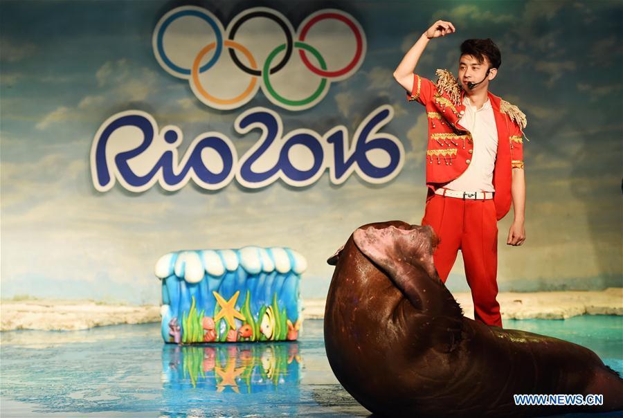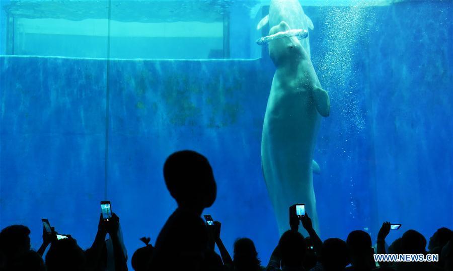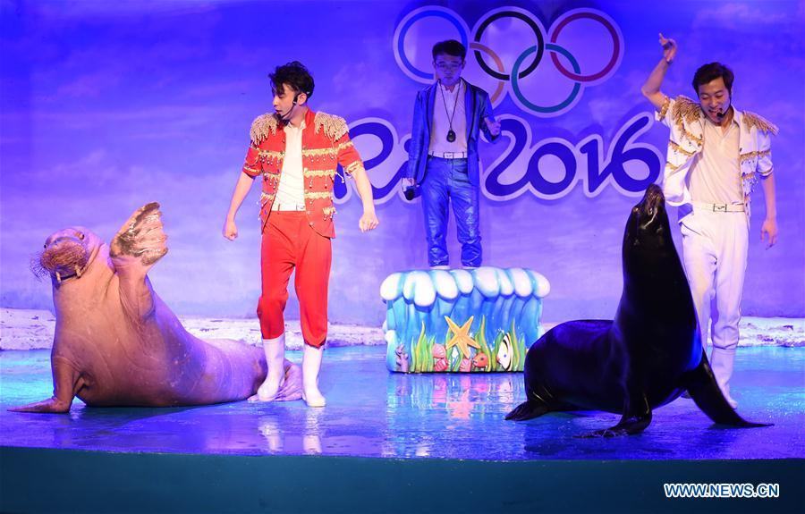 A white whale makes a performance at the Polarland in Harbin, capital of northeast China's Heilongjiang Province, Aug. 11, 2016. Animals here on Thursday attended various performances to cheer up for the ongoing Olympic Games. (Photo:Xinhua/Wang Jianwei)