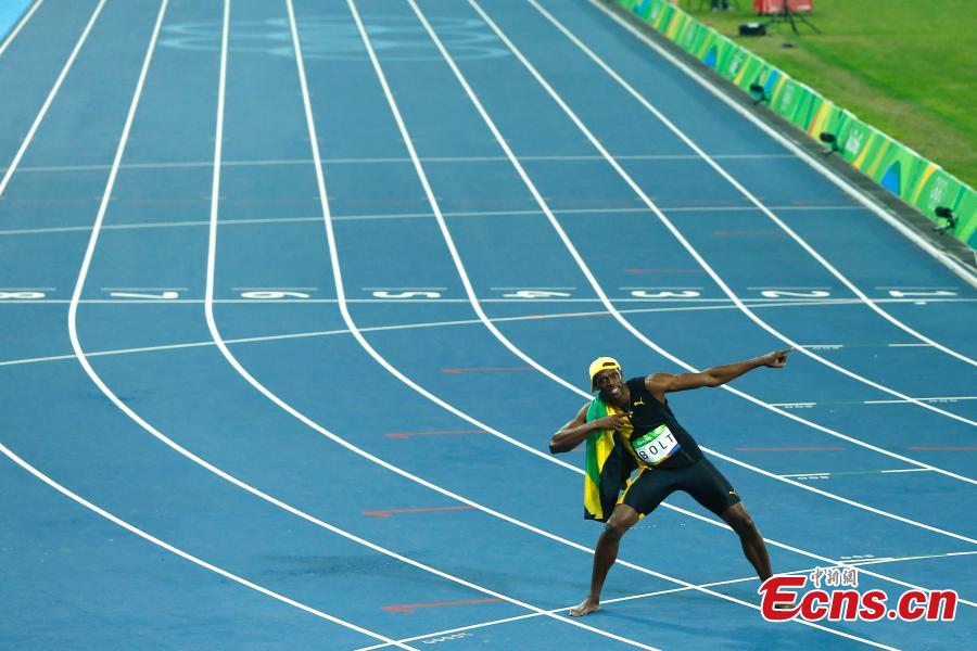 Jamaica's Usain Bolt celebrates as he wins gold in the men's 100-meter final during the athletics competitions of the 2016 Summer Olympics at the Olympic stadium in Rio de Janeiro, Brazil, Aug. 14, 2016. (Photo: China News Service/Sheng Jiapeng)