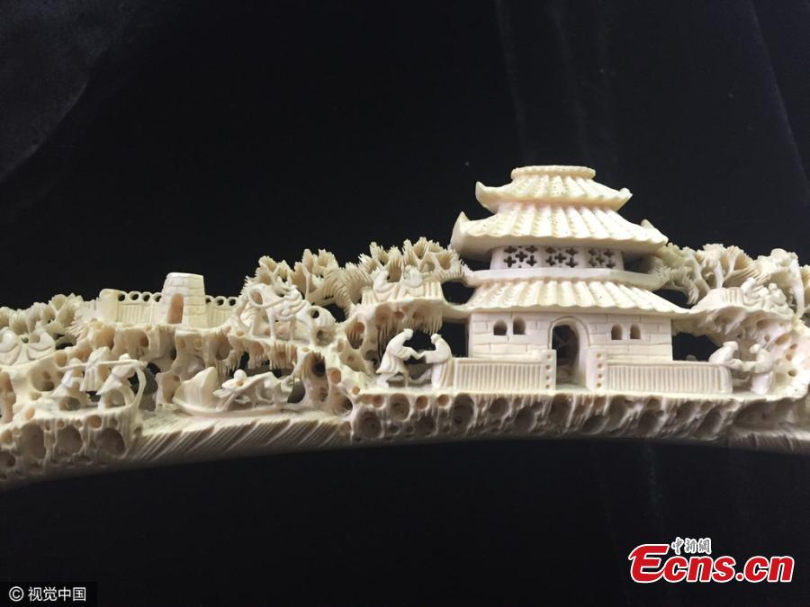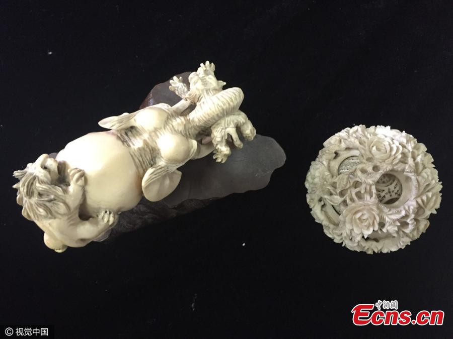Ivory carvings seized by customs on display in Beijing, Aug. 5, 2016. Customs authorities in Shijiazhuang, Hebei Province and Beijing joined forces to seize 1,639 pieces of ivory weighing a combined 101.4 kilograms in a recent raid on smuggling. Hidden in 15 boxes, the carvings were delivered to Langfang, Hebei Province from Japan under the false customs declaration as handicrafts. It is the largest case against ivory smuggling by customs in recent years. (Photo/CFP)