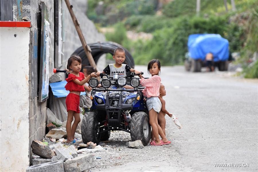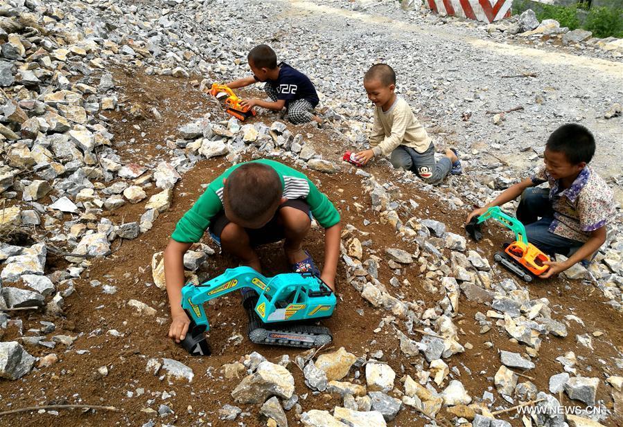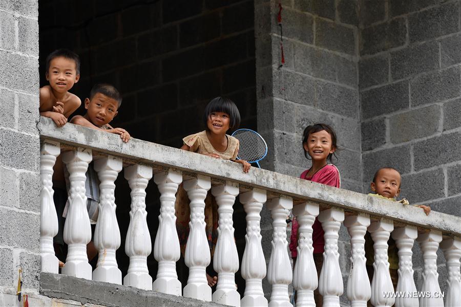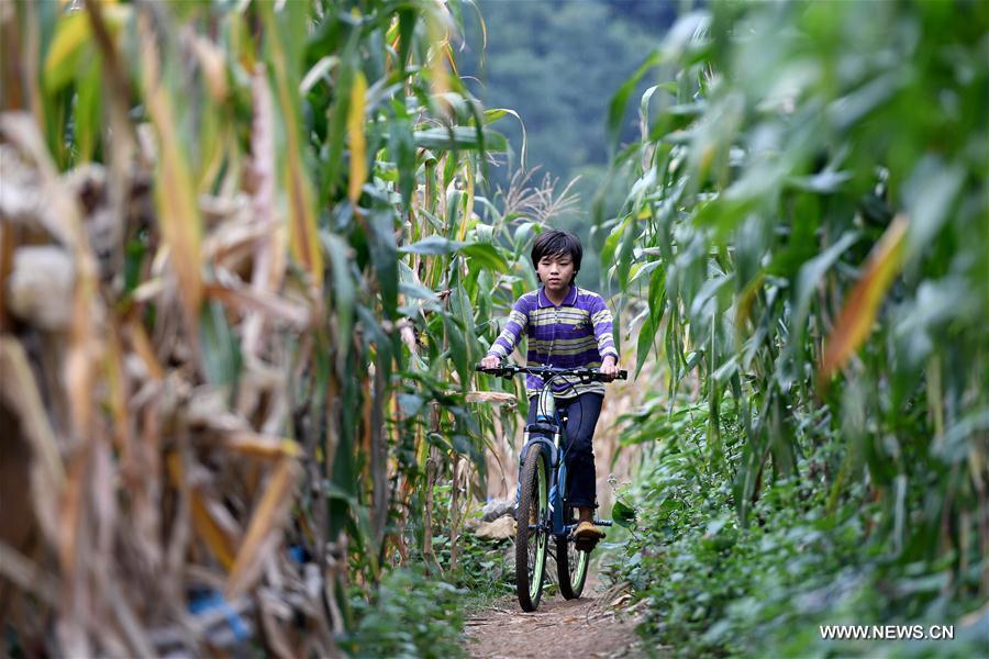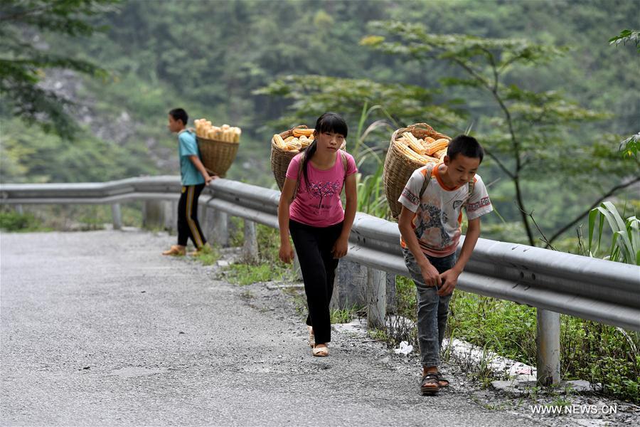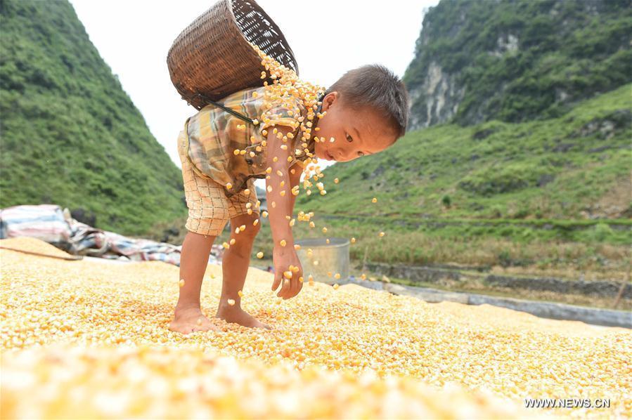 7-year-old Lan Guijing helps airing corn during summer vacation in Nongyong Village of Dahua Yao Autonomous County, south China's Guangxi Zhuang Autonomous Region, Aug. 7, 2016. According to the latest government figures, more than 3 million people have been pulled out of poverty over the past four years in Guangxi's stony desertification area of about two million hectares. So far, about 280,000 hectares of such landscape has been treated, according to Huang Shiyong, vice chairman of the regional government. (Xinhua/Huang Xiaobang)