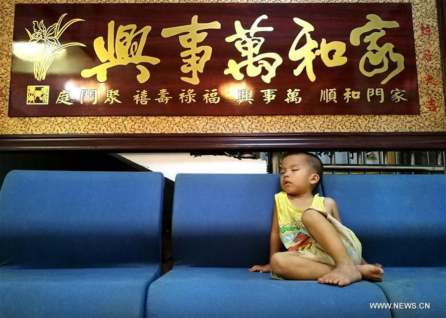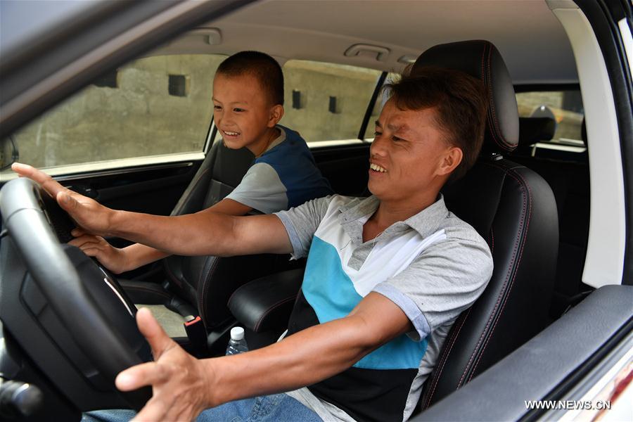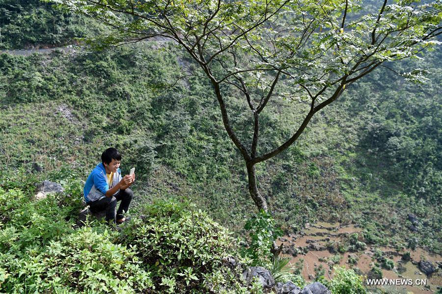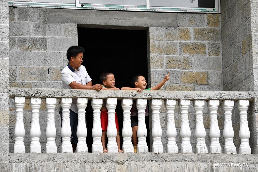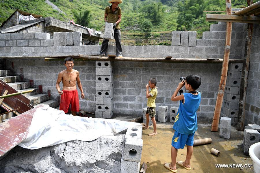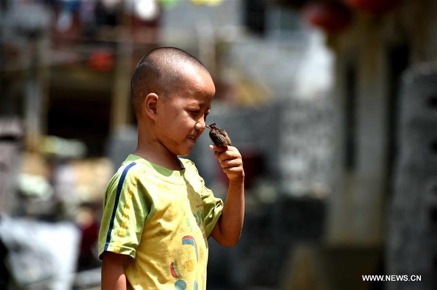 7-year-old Lan Guijing helps airing corn during summer vacation in Nongyong Village of Dahua Yao Autonomous County, south China's Guangxi Zhuang Autonomous Region, Aug. 7, 2016. According to the latest government figures, more than 3 million people have been pulled out of poverty over the past four years in Guangxi's stony desertification area of about two million hectares. So far, about 280,000 hectares of such landscape has been treated, according to Huang Shiyong, vice chairman of the regional government. (Xinhua/Huang Xiaobang)